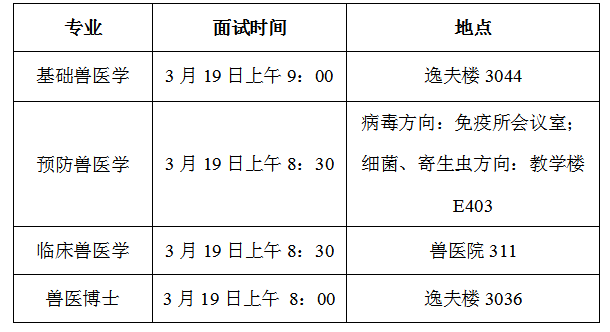 1、面试时间:每人15分钟,2分钟英语口语表述,8分钟PPT学术演讲(硕士研究进展与学术成绩、攻博期间学术规划),5分钟提问。兽医博士每人10分钟,5分钟PPT学术演讲(研究进展与成果、攻博期间规划),5分钟提问。