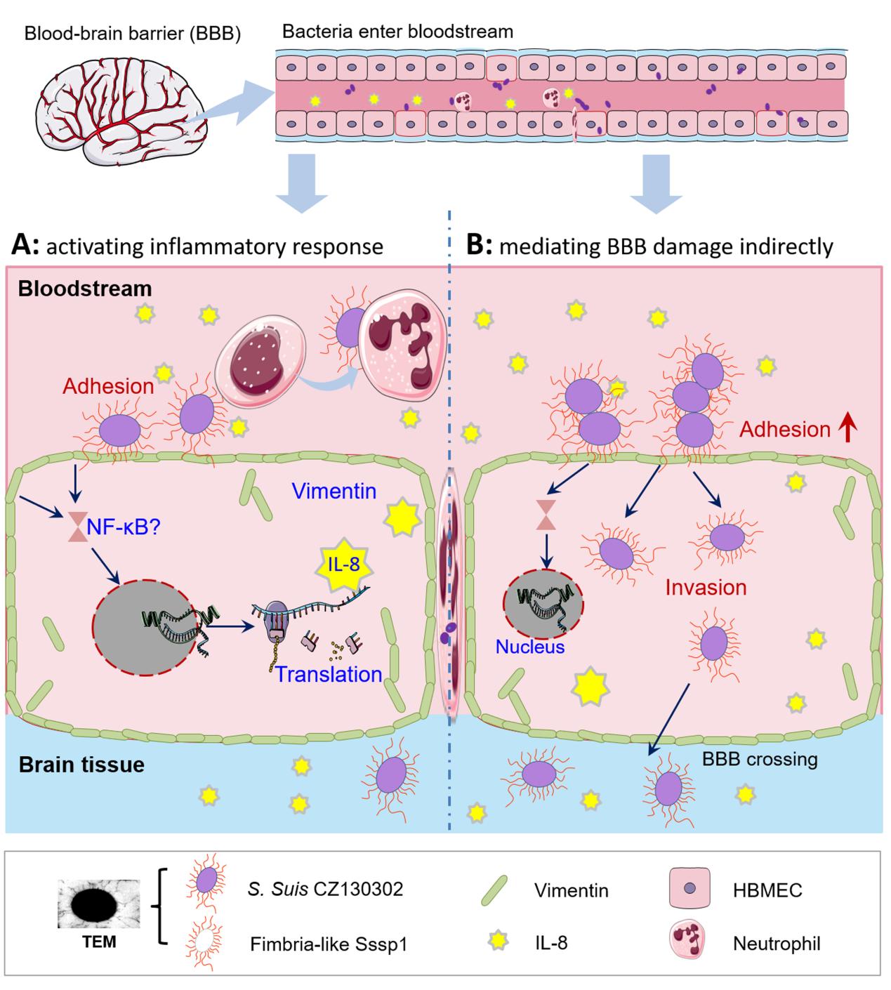 图示:猪链球菌类菌毛结构结合脑血管内皮细胞波形蛋白促进宿主形成脑膜炎的机制