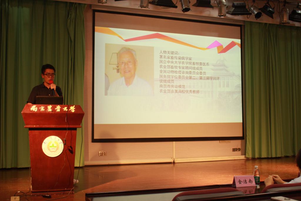 随后,邓世宇、王宁宁、张微、陈楷文、臧琦铭5人分别分享了老先生祝寿康、陆天水、侯加法、蔡宝祥、邹思湘的成长故事。邓世宇通过“老顽童先生、绅士先生、耐心先生”三个小故事向同学们展现了一个和蔼和亲、平易近人的祝寿康老师;王宁宁详细的描述陆天水老师的求学、科研等内容,尤其介绍了其在水牛研究领域做出的重要贡献;张微详细介绍了侯加法老师读书时期和教学时期的经历,着重介绍了当时教学设备简陋老师亲自备课,并且还介绍了当时的投影仪和幻灯片;陈楷文介绍了蔡宝祥老师在克隆N79株鸡新城疫弱毒疫苗等做出的杰出贡献,此外还展示了蔡老师的很多具有纪念意义的照片;臧琦铭围绕“没有学位证,依旧是大师”,详细介绍了邹思湘老师学习、教学、实验和退休等经历,尤其介绍了其在新生仔猪肠道被动免疫转移实验和安装永久瘤胃瘘管做出的贡献。