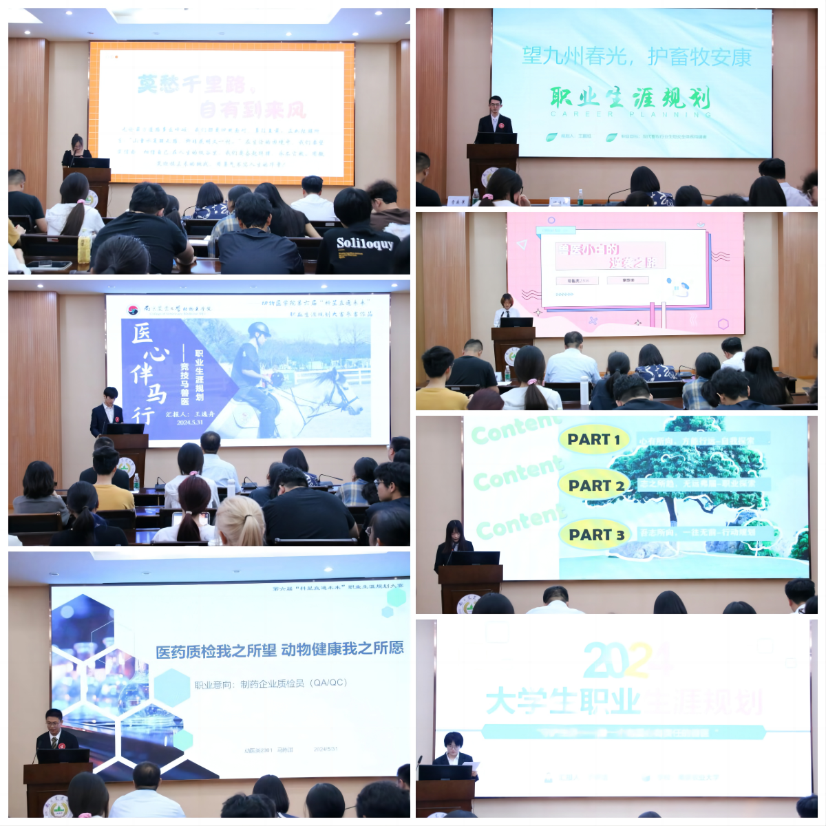 现场七位选手的展示各具特色。1号选手王逸舟勇于探索实践,与马儿结下不解之缘,立志成为一名竞技马兽医,化身马儿的守护者。2号选手李烨坤怀揣着对一线临床兽医的敬仰,希望为我国畜牧行业发展添砖加瓦。3号选手王钰涵对生物制药领域有着浓厚的兴趣,致力于成为一名兽药公司研发人员。4号选手马陈国对药学好奇心满满,理想成为一名制药企业质检员,为药企检疫保驾护航。5号选手王鹏旭线上线下齐头并进,关注我国生猪养殖行业需求,志愿投身于构建现代畜牧行业生物安全体系的行列去。6号选手于忻洁不忘初心,追逐儿时种下的梦想,志愿成为一名动物防疫医师,呵护动物健康。7号选手李欣悦向外关注时事的同时向内自我探索,愿将一生奉献于栽培祖国的花朵。
