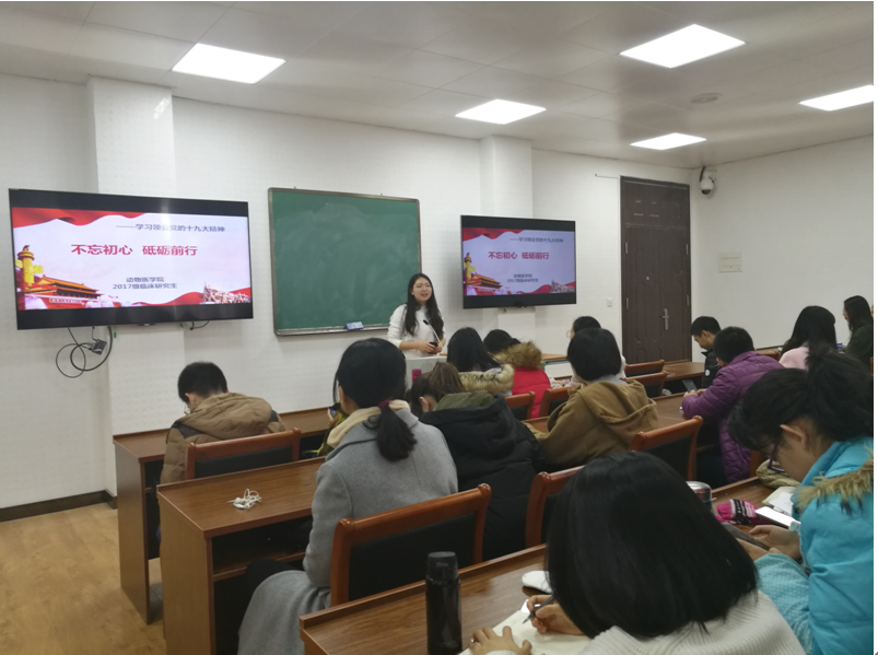 为了进一步学习宣传贯彻党的十九大精神,深入开展“两学一做”学习教育,2017年12月9日,在兽医院311室举行2017级临床系研究生第二党支部“学习领会党的十九大精神”的党建活动。活动主题为“不忘初心 砥砺前行”。本次活动由支部副书记樵明玉同学主持,2017级全体研究生共同参与学习。