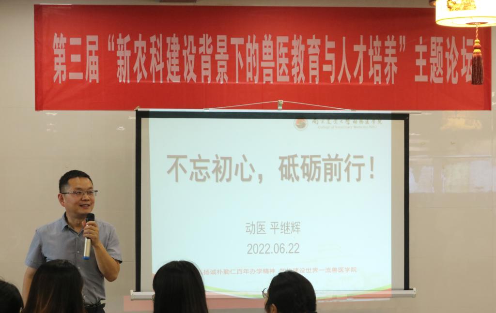 beat365唯一官方网站第三届“新农科建设背景下的兽医教育与人才培养”主题论坛在校教工食堂二楼顺利举行。学院党政领导、学科点长、系主任、导师代表、2018级本科生班主任、2018级部分学生代表共计90余名师生参加了此次论坛。论坛包括学科介绍、行业交流、生涯辅导、自由交流四个环节,由院党委副书记刘照云主持。