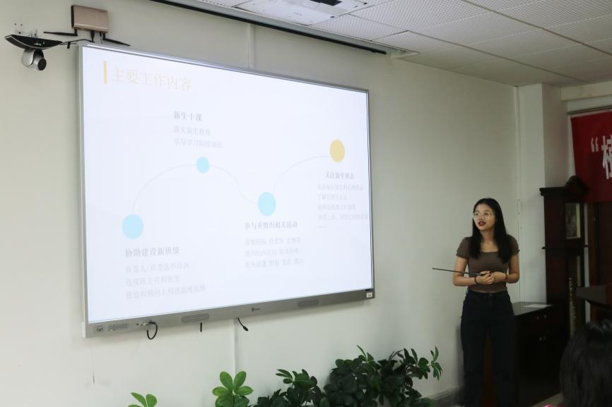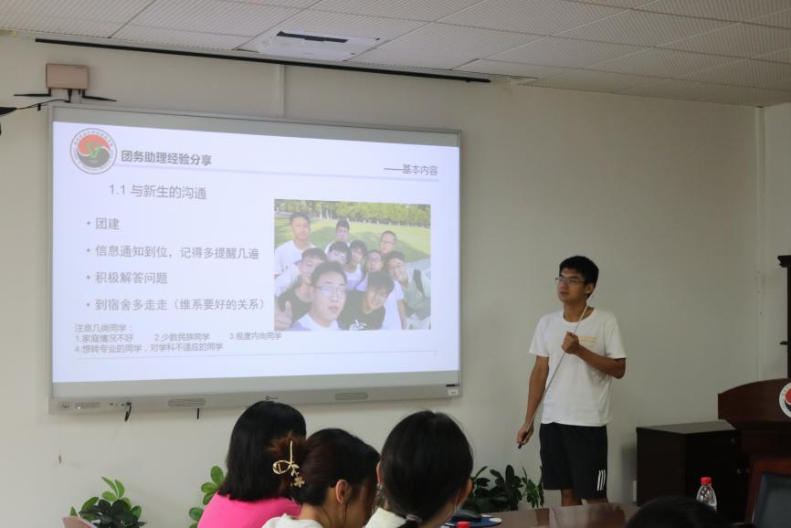 最后,肖雨主要介绍了新生团务助理的主要工作内容,并分享了一些可供参考的活动。作为新生团务助理,要承担好协助建设新班级、落实新生教育、组织并参与相关活动以及时刻关注新生状态的责任。肖雨建议,新生团务助理军训期间与新生一对一交流,确保对每位同学有基本的了解,以及班委选举结束后,定期随机找班委与非班委了解班级状况,及时发现并解决可能存在的问题与矛盾等。