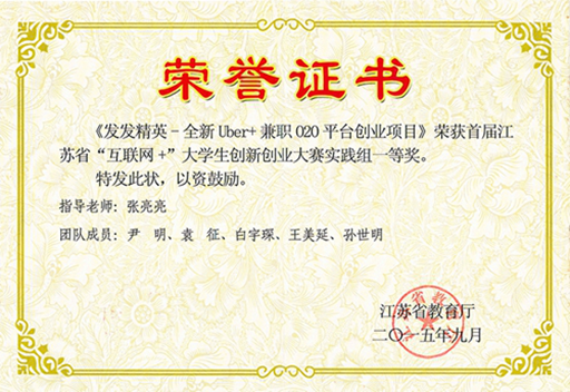 9月14日,首届江苏省“互联网+”大学生创新创业大赛决赛在南京落幕,beat365官网袁征、白宇琛两位本科学生参与的“发发精英——全新Uber+兼职O2O平台创业项目”从全省95所高校的1622件项目中脱颖而出,获一等奖,以实践组第二名的成绩与其他15支项目团队共同组成江苏代表队,参加全国总决赛。