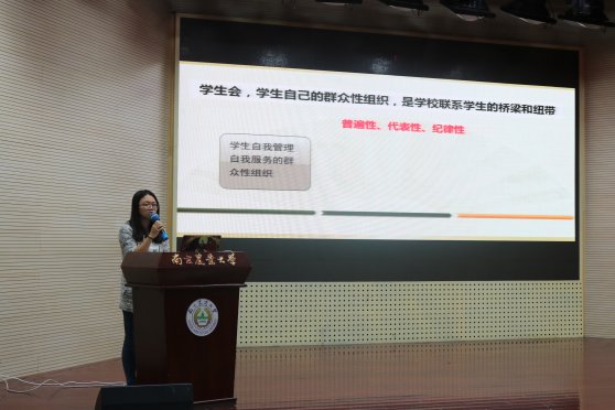 金洁南以“如何进行活动的策划与实施”为题进行讲座。她提到:学生骨干是一个服务者,而不是指挥者,需要为同学们奉献自己。接着她对活动策划与实施进行详细讲解,并提出学生骨干 “不忘初心,方得始终”的观点。