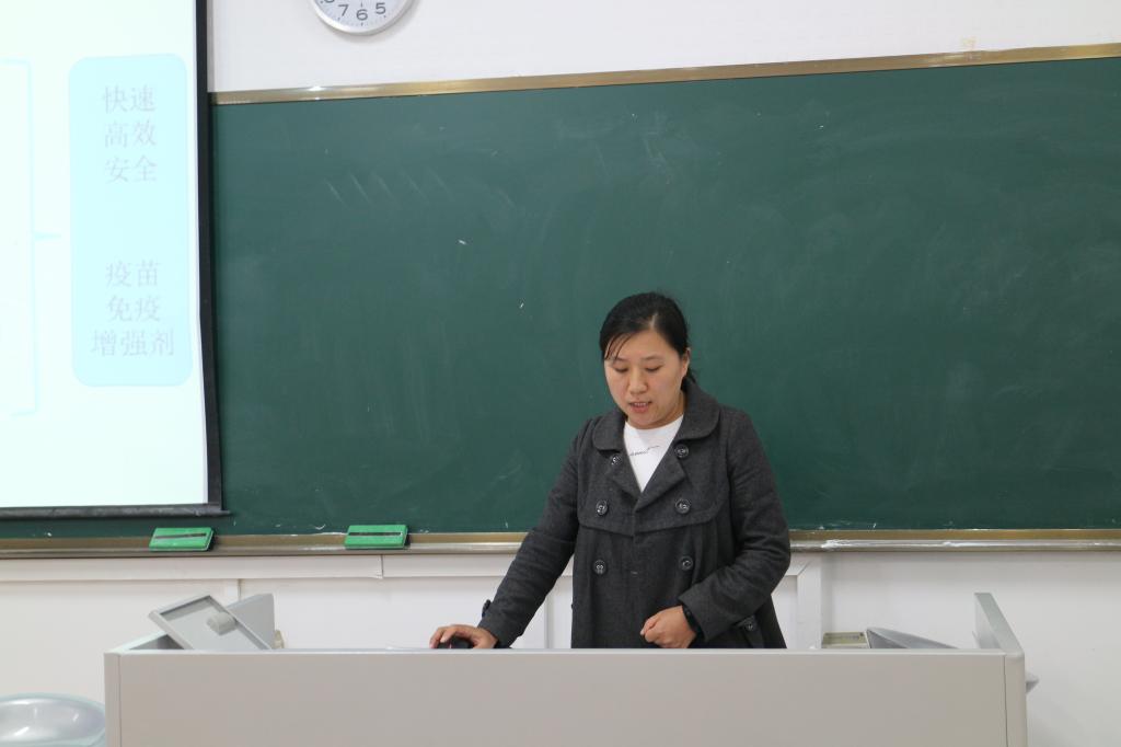 紧接着是博士生陈瑾汇报她的研究内容《CVC1302对口蹄疫苗免疫增强效力及机理研究》,试验对免疫增强剂单方及复方配伍,商品化口蹄疫苗/灭活抗原,进行动物实验,筛选仔猪FMD LPB-ELISA 抗体,选出抗体水平明显提高组,同时对动物实验组方进行进一步优化。现已获得一种可以明显提高口蹄疫灭活疫苗免疫效力的增强剂,可以明显提高现有疫苗的LPB-ELISA 抗体滴度,延长抗体的延续期,实验后续将进一步完善以小鼠为模型的免疫机理研究,并对疫苗抗体产生以及氧化应激状况进行评价。