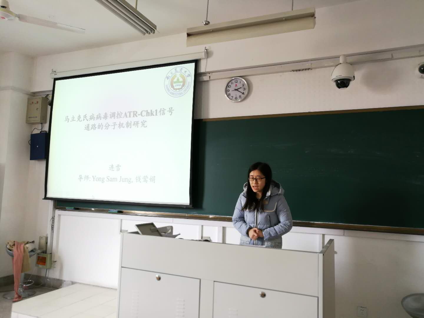 接下来是博士生连雪,题目为《马立克氏病病毒调控ATR-Chk1信号通路的分子机制研究》。主要研究ATR-Chk1通路(DNA损伤应答通路)与MDV感染的互作机制。MDV感染引起ATR-Chk1通路的激活,其不利于MDV复制。而MDV可引起细胞内ROS水平升高,激活STAT3通路,从而抑制ATR-Chk1通路,以利于MDV在细胞内的生命活动。