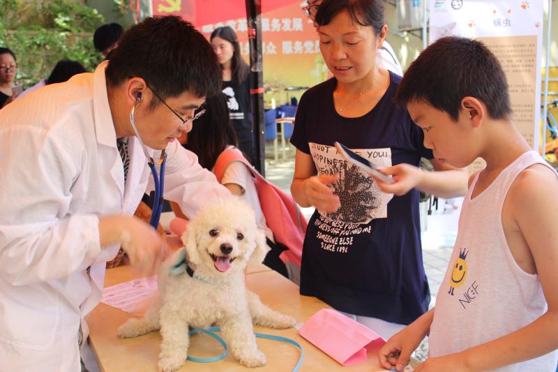 活动中,beat365唯一官方网站动物医院副教授邓益锋、姚大伟带领10多名动物医学专业学生在富康社区天地花园为社区宠物提供免费诊断和宠物美容,社区居民纷纷带着爱宠前来问诊、美容。