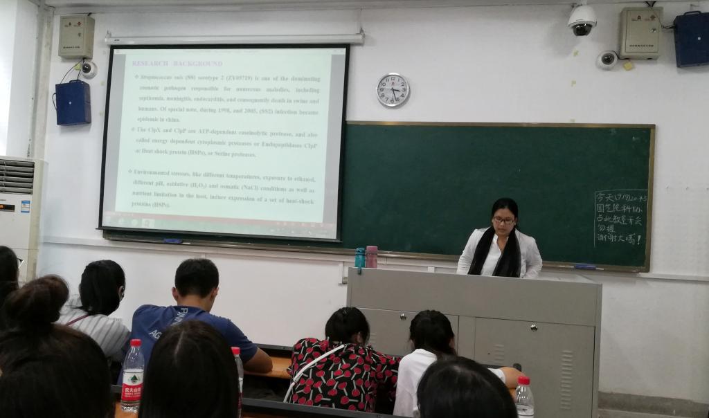 第二位博士生是马可,他的报告《CRISPR相关基因cas9在无乳链球菌毒力上的调控作用》详略得当,十分精彩。第三位博士生是Memon Muhammad Ali,他所作的报告《Characters of Th9 immune responses induced by Haemonchus contortus in goat》,主要内容是捻转血矛线虫引起的山羊的Th9免疫反应的特征。最后一位博士生ROY SHIPRA带来的汇报是《Characterization and functional analysis of the ATP-dependent protease ClpX involved in the stress tolerance and virulence of the Streptococcus Serotype 2》。