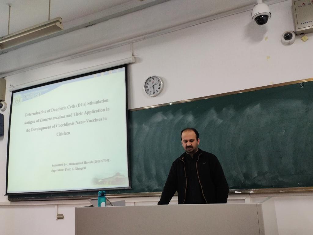 第二位博士生是Muhammad Haseeb,他所作的报告《Determination of Dendritic Cells(DCs)Stimulation Antigen of Eimeria maxima and Their Application in the Development of Coccidiosis Nano-Vaccines in Chicken》 ,主要内容是研究治疗艾美尔球虫的疫苗。