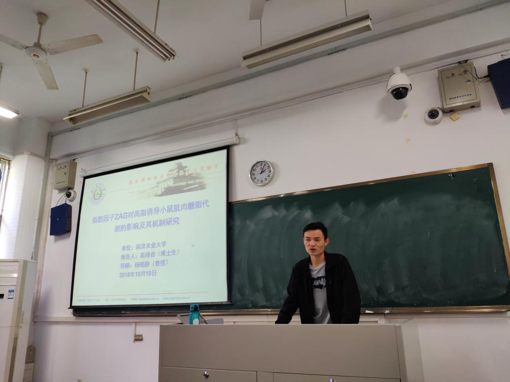 首先,第一位博士生高诗杏以《脂肪因子ZAG对高脂诱导小鼠肌肉糖脂代谢的影响极其机制研究》为题,阐述了自己近期的实验汇报。讲述了ZAG如何改善高脂日诱导的肥胖以及影响胰岛素代谢通路,为进一步研究奠定了良好的基础,报告精彩详实,老师给予了高度评价。