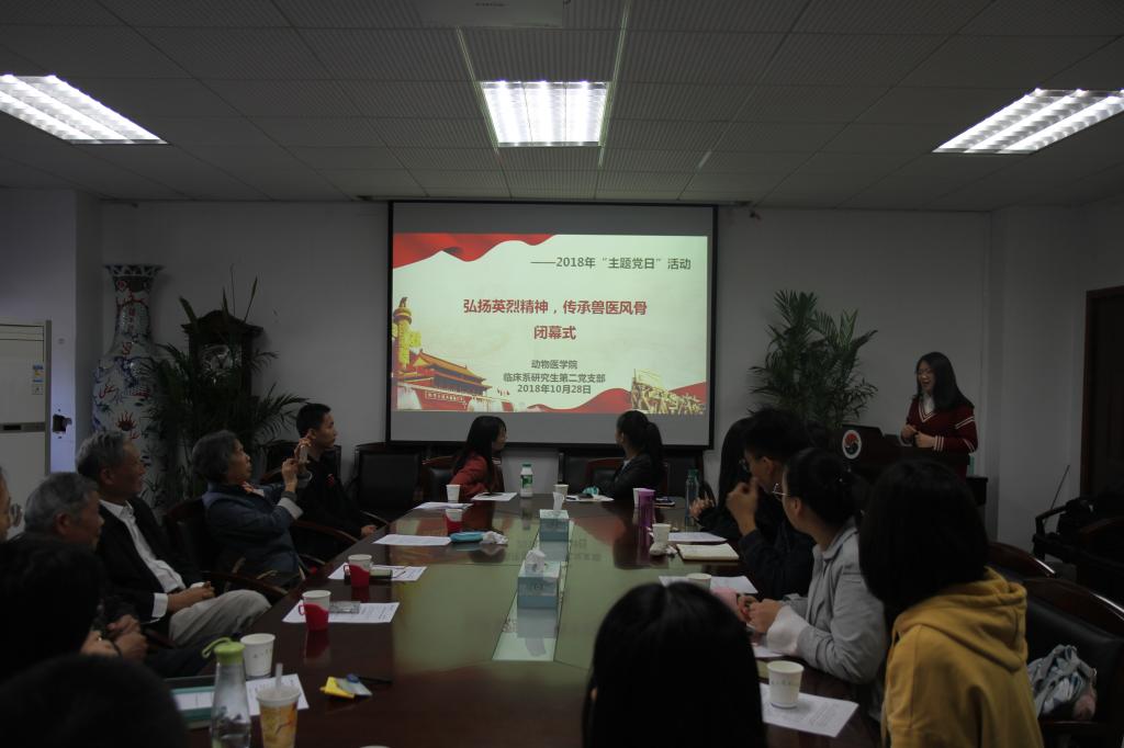 活动最后召开了临床系研究生第二党支部2018年“主题党日”活动——“领略历史成就,传承兽医风骨”的闭幕式。支部副书记樵明玉同学简要回顾了这一年来本支部组织举办的各项活动,着重总结了本次“党日活动”,并对三位老教授、支部书记王德云老师、支部委员以及所有支部成员的对支部活动的支持表示感谢。