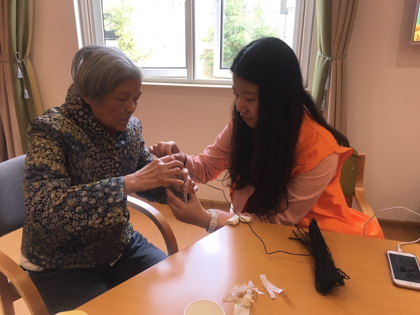 回到康养中心,志愿者们表演了为爷爷奶奶准备的歌舞节目。室内掌声笑声不时响起,还有两名志愿者准备了干花和花瓶,邀请奶奶们一起插花。