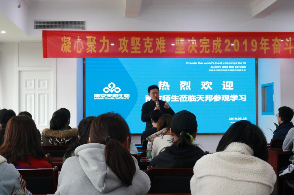 3月28日,辅导员李欣欣和兼职辅导员邹剑文带领着第一组的同学,来到了南京天邦生物科技有限公司。同学们最先来到公司广场,并由接待讲解人员带入公司大院,了解公司文化而后在公司楼前合影。随后在讲解员的带领下,同学们来到了疫苗车间,由于是无菌环境,同学们在厂房门口通过监控了解厂内的生产过程,并由车间主任负责讲解。接着,大家沿公司内的主路依次参观了灭毒车间、动物房等。