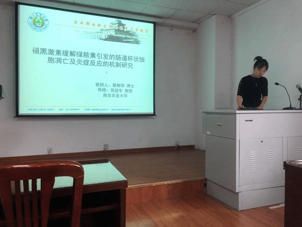 第三位是博士生蔡柳萍,她的汇报题目是《褪黑激素缓解PCN引发的肠道杯状细胞凋亡及炎症反应的机制研究》。她在最后对PCN对线粒体功能、促进肠道杯状细胞凋亡功能进行总结,并证明褪黑激素对于PCN所引发的结肠杯状细胞损伤具有缓解作用,并且是通过GR来缓解加速损伤坏死。对此,庾庆华老师进行了点评与讨论。