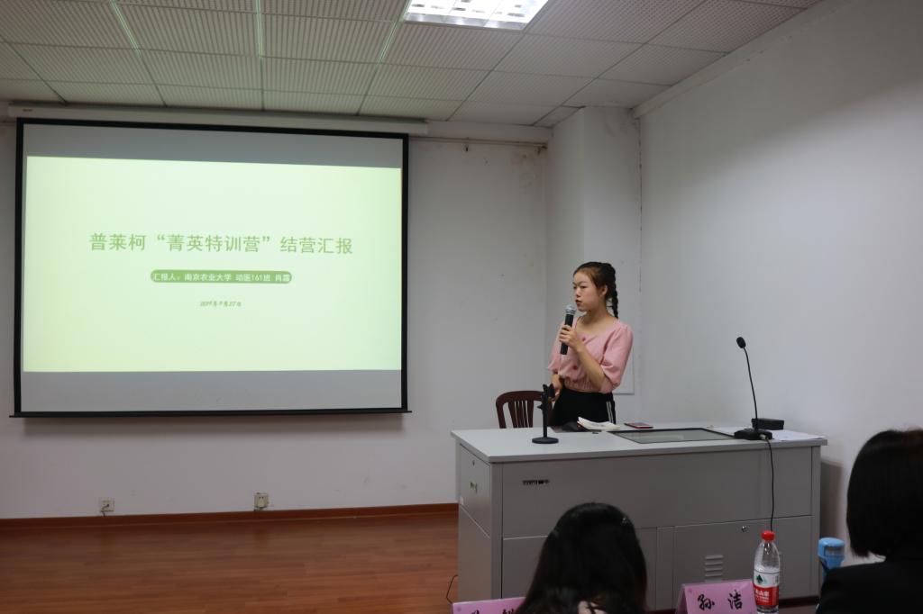随后张沁莹、肖霜、岳一芃、王钰、刘婷婷依次对暑期“菁鹰特训营”进行了回顾。普莱柯“菁鹰特训营”涵盖了企业参观、畜牧兽医专题培训、兽医技术专题培训、实验室检测专题培训、基层实习等多个板块,前期培训规范有序,为后期实践打下了坚实的基础。张沁莹表示,培训结束之后,自己和岳一芃前往圣迪乐村,深入在鸡场进行学习,实习过程中,工作人员非常亲切,耐心解答她们的疑问;肖霜和刘婷婷则表示,两人在湘佳牧业进行轮岗实习,曾在实验室、饲料检测部门、孵化部、食品检测部等多个部门学习,专业技能得到了极大的提升;王钰则通过丰富的病例,分享了广西园丰牧业的点点滴滴。