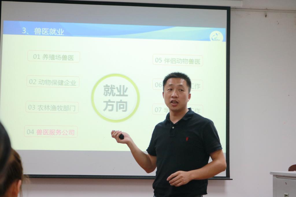 接着,康笃利以《非洲猪瘟对兽医行业的影响与思考》为题做专题报告。结合自身十年兽医从业经验,他从行业角度对非洲猪瘟进行解读,并对公司科研情况和实习情况进行了概述。康笃利告诉同学们:职业方向的选择不要局限于传统,要多关注新兴行业;想在兽医行业有好的发展,一定要有专业的知识和技能。