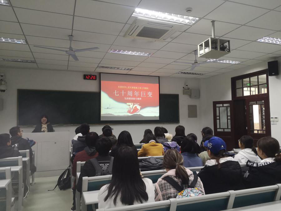 在此次主题团日活动中,各团支部活动内容丰富,活动成果突出。在动医184班“‘献礼新中国成立七十周年’—感受七十年间的变化”的主题团日活动中,班级通过观看“七十周年巨变”PPT,回顾中华人民共和国成立以来70年的历史进程,加深对于祖国历史的理解,感受祖国七十年之间的变化并引导同学们相互交流心得。之后,发起“青春有目标,学习有动力”的主题班会,制定目标且明确努力方向。