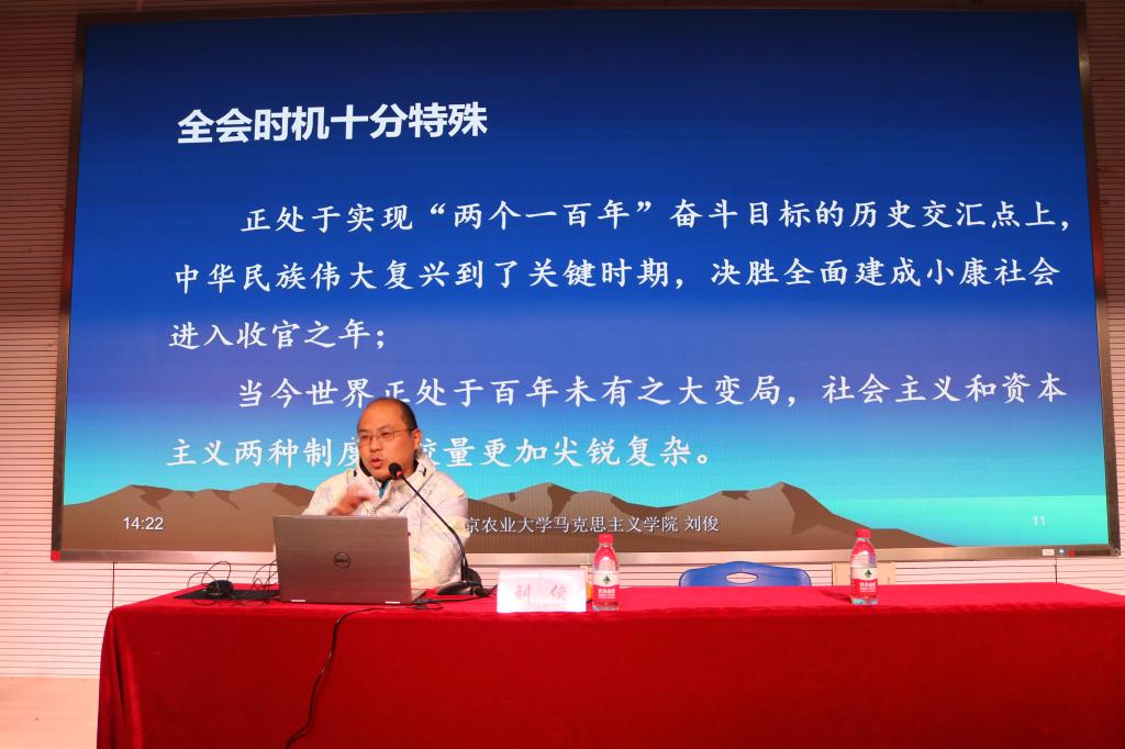刘俊紧扣党的十九届四中全会内容,以《一国两制是中国特色社会主义制度的显著优势》为主题,围绕“党的四中全会基本情况及重大意义”、“准确把握《中共中央关于坚持和完善中国特色社会主义制度,推进国家治理体系和治理能力现代化若干重大问题的决定》的总体要求、总体目标和重点任务”、“确保全会确定的各项目标任务全面落实到位”三个方面进行阐述。
