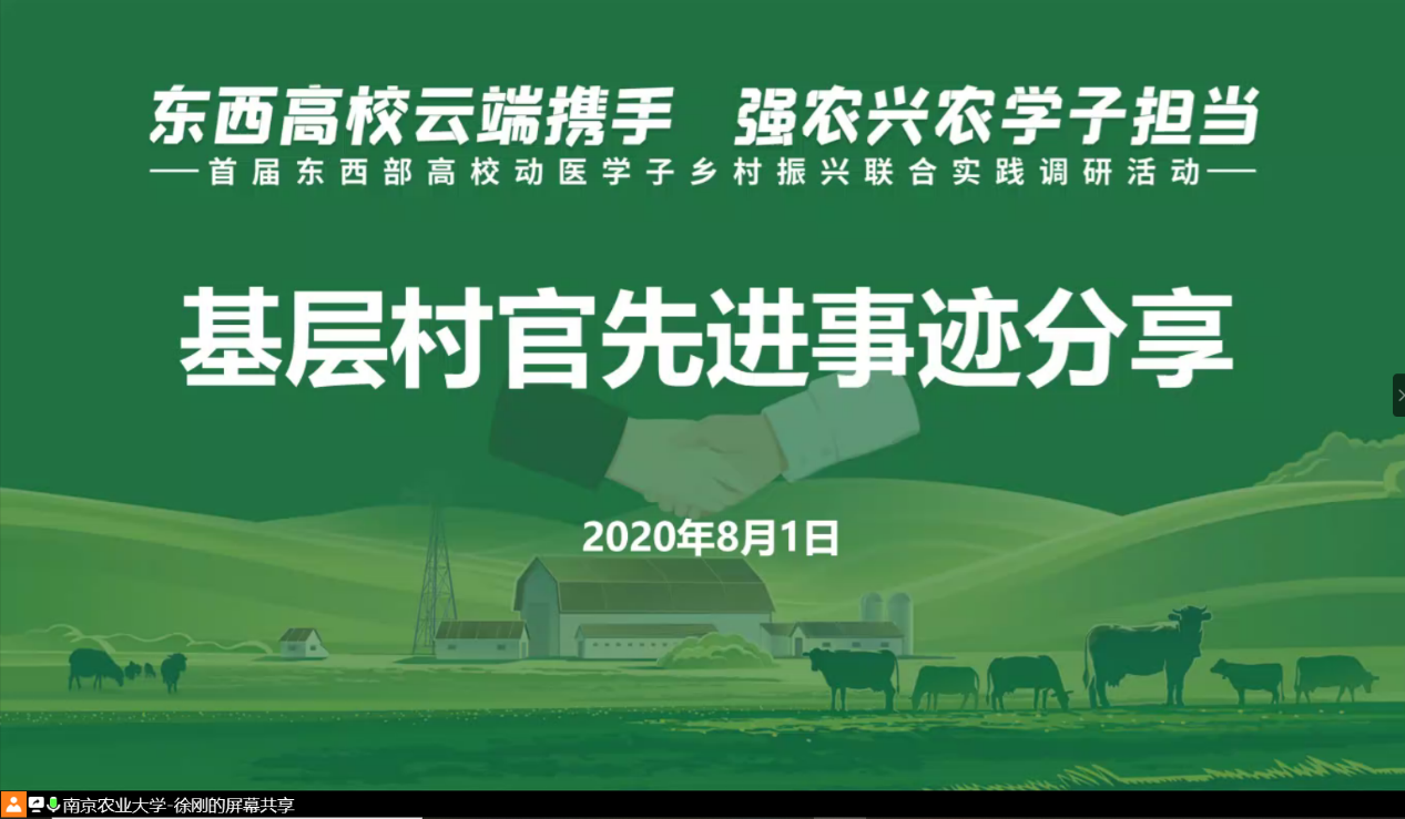 8月1日下午,由beat365唯一官方网站发起,联合东西部7所涉农高校共同开展的“东西高校云端携手,强农兴农学子担当”首届东西部高校动医学子乡村振兴联合实践调研活动,进行了线上的基层村官先进事迹分享会活动。三位基层村官讲述他们实地工作中与脱贫攻坚、乡村振兴的故事,分享会由辅导员徐刚主持。