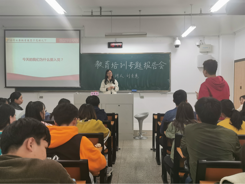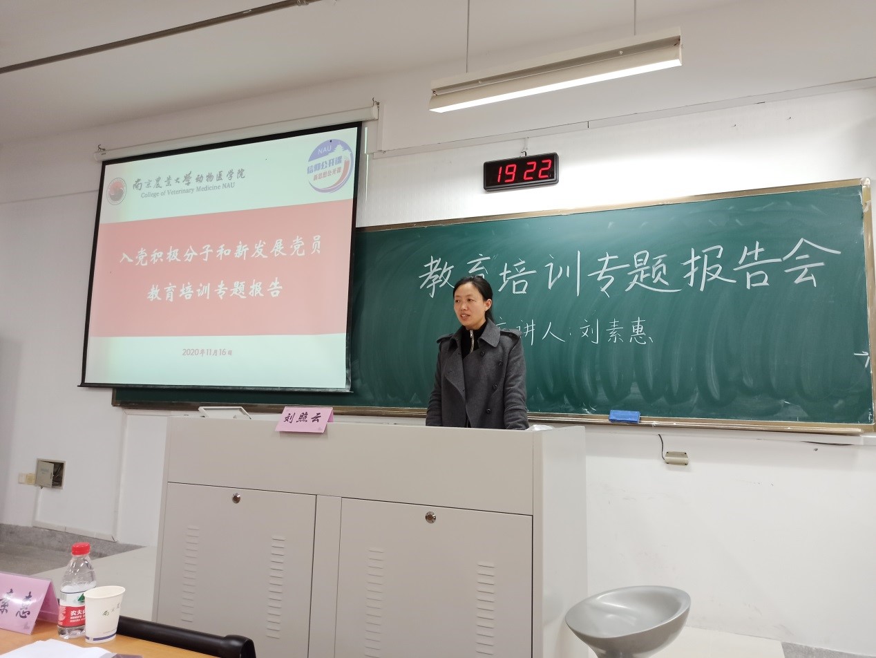 11月16日下午6:30,beat365官网在教四楼B202举行了入党积极分子和新发展党员教育培训专题报告,主讲人为动物科技学院学生工作办公室主任、团委书记、本科生第一党支部书记刘素惠。报告由beat365唯一官方网站党委副书记刘照云主持,beat365唯一官方网站全体新发展党员和入党积极分子到场参会。