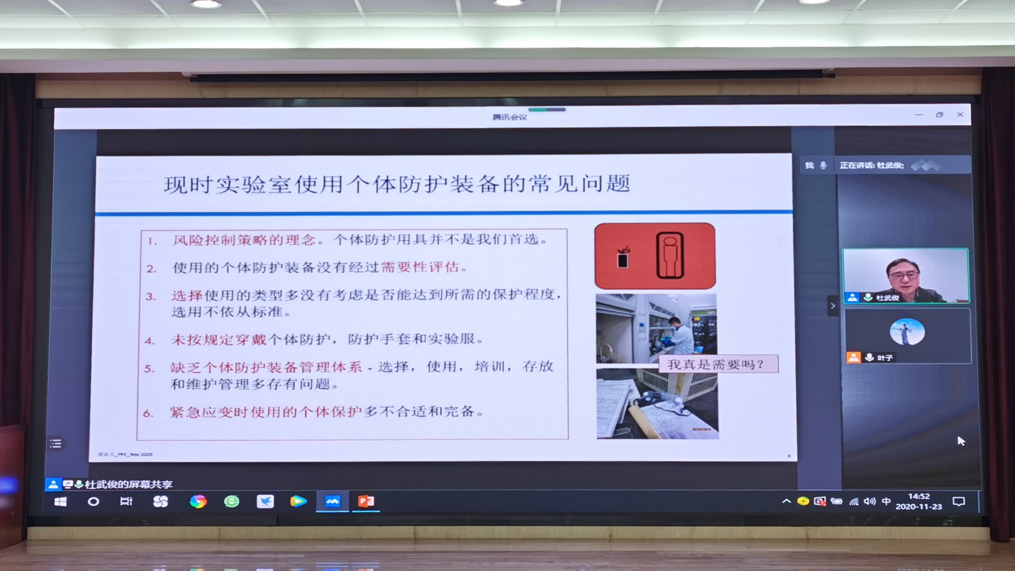 首先由来自香港科技大学的杜武俊老师通过视频会议的方式进行《实验室个体防护装备的选择和使用》讲座报告,他围绕风险控制策略与个体防护用具的使用、身体防护、眼和面部保护、呼吸防护及手部防护等多个方面展开,讲述了实验室个体防护的重要性和应该进行的具体举措。报告内容十分详尽,与日常生活紧密贴合。