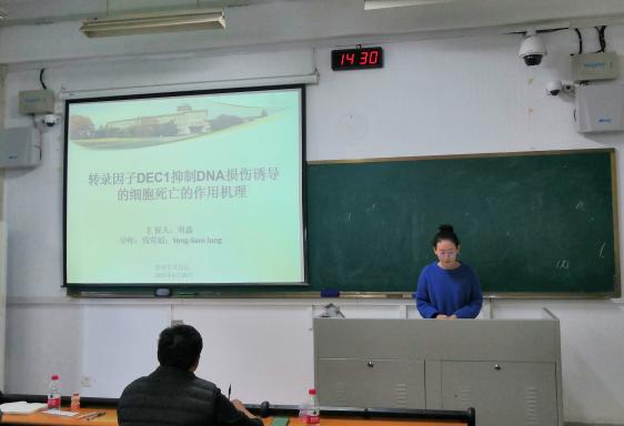 汇报题目为《转录因子DEC1抑制DNA损伤诱 导的细胞死亡的作用机理》。探究了转录因子DEC1通过Clusterin调节DNA损伤诱导的细胞死亡,在几种癌细胞中通过过表达DEC1探究对下游靶基因的影响,再通过基因沉默等实验进行验证,内容丰富,成果突出,获得老师一致好评。