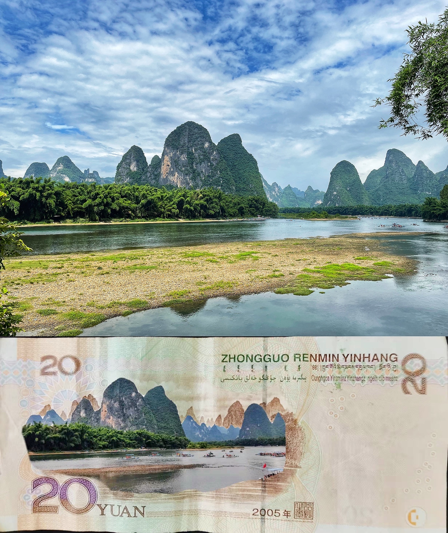很快,大家四人组队坐上了江面的竹筏,随着水波荡漾缓缓沿漓江出发,游赏一路山水风光。转乘观光电车,持续向山水进发,来到著名的二十元人民币图案景观处。