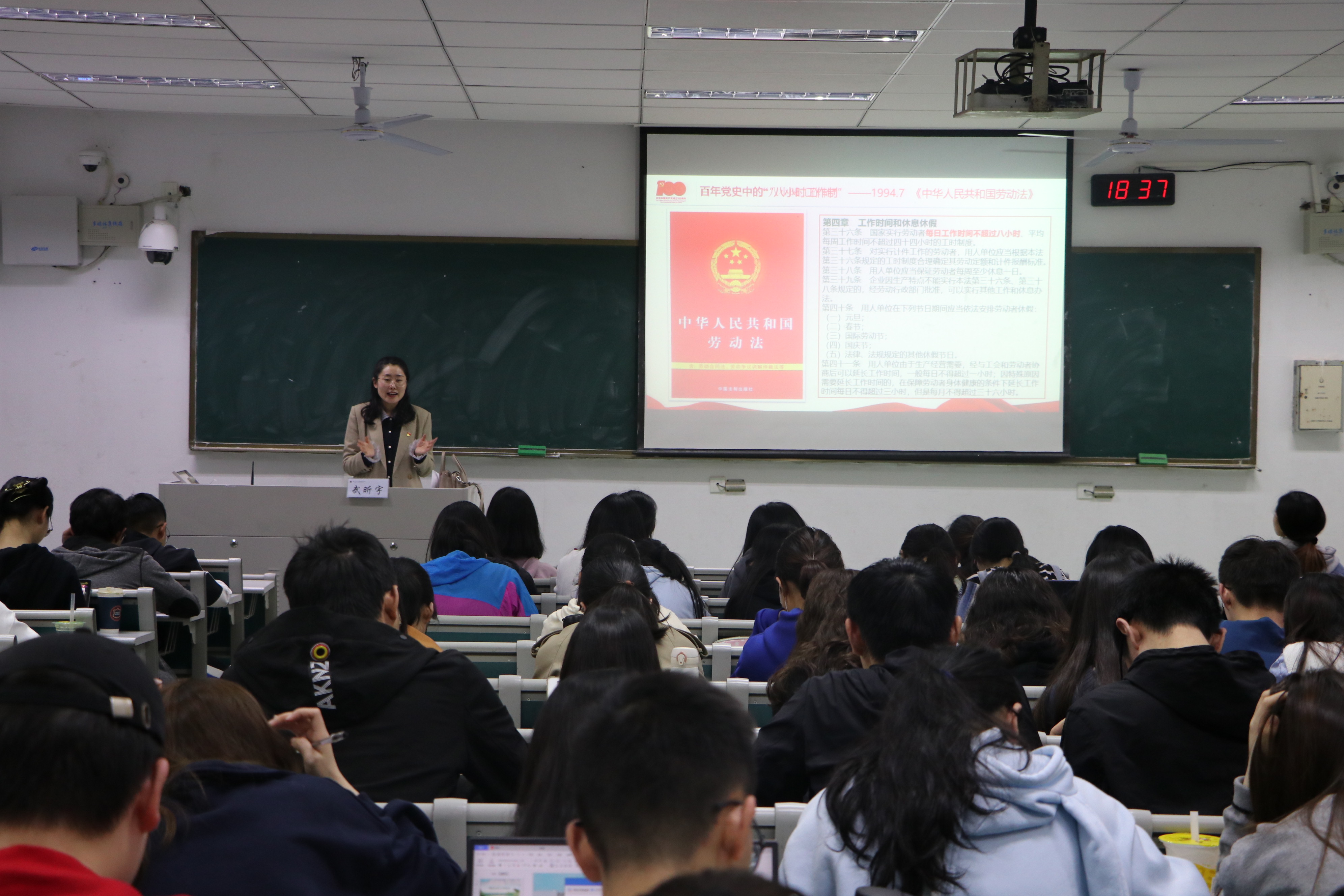 第一部分,武昕宇从“假如你是一名劳动者,你会关心什么?”入手,向同学们提出“中国八小时工作制从什么时候开始”的问题。武昕宇向大家分享了自己在学生就业指导工作中的发现——当下青年对工作的满意度从主要关注工资薪酬,转变为主要关注工作时长的现象,借此引出接下来的内容。