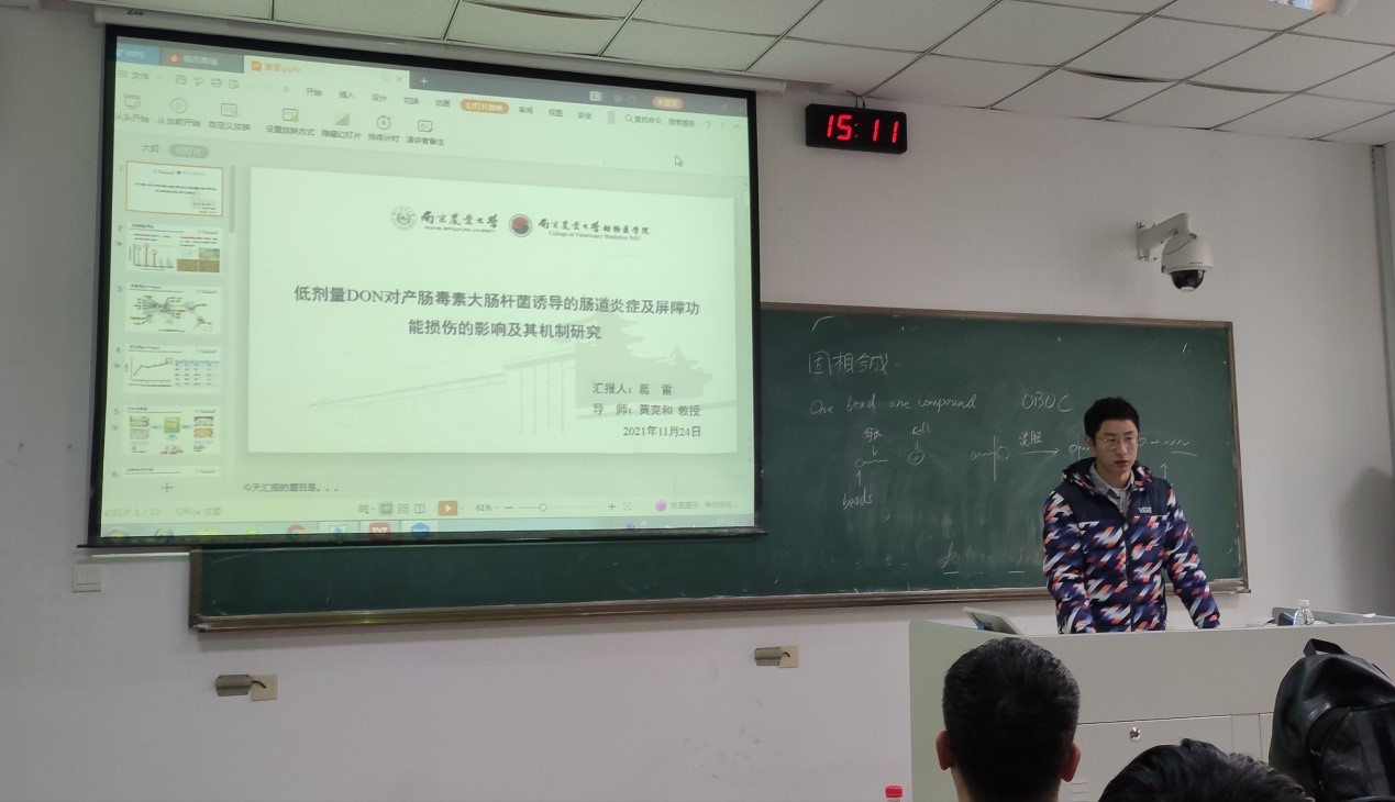 第二位汇报人是来自临床兽医学的博士生葛雷,他汇报的题目是《低剂量DON对产肠毒素大肠杆菌诱导的肠道炎症及屏障功能损伤的影响及其机制研究》,汇报的内容主要是低剂量DON加剧ETEC感染造成的肠道炎症和屏障功能损伤,以及自噬相关蛋白LC3和NLRP3炎性小体在该现象中所起的调控作用。该汇报内容新颖,得到评委老师的一致好评。