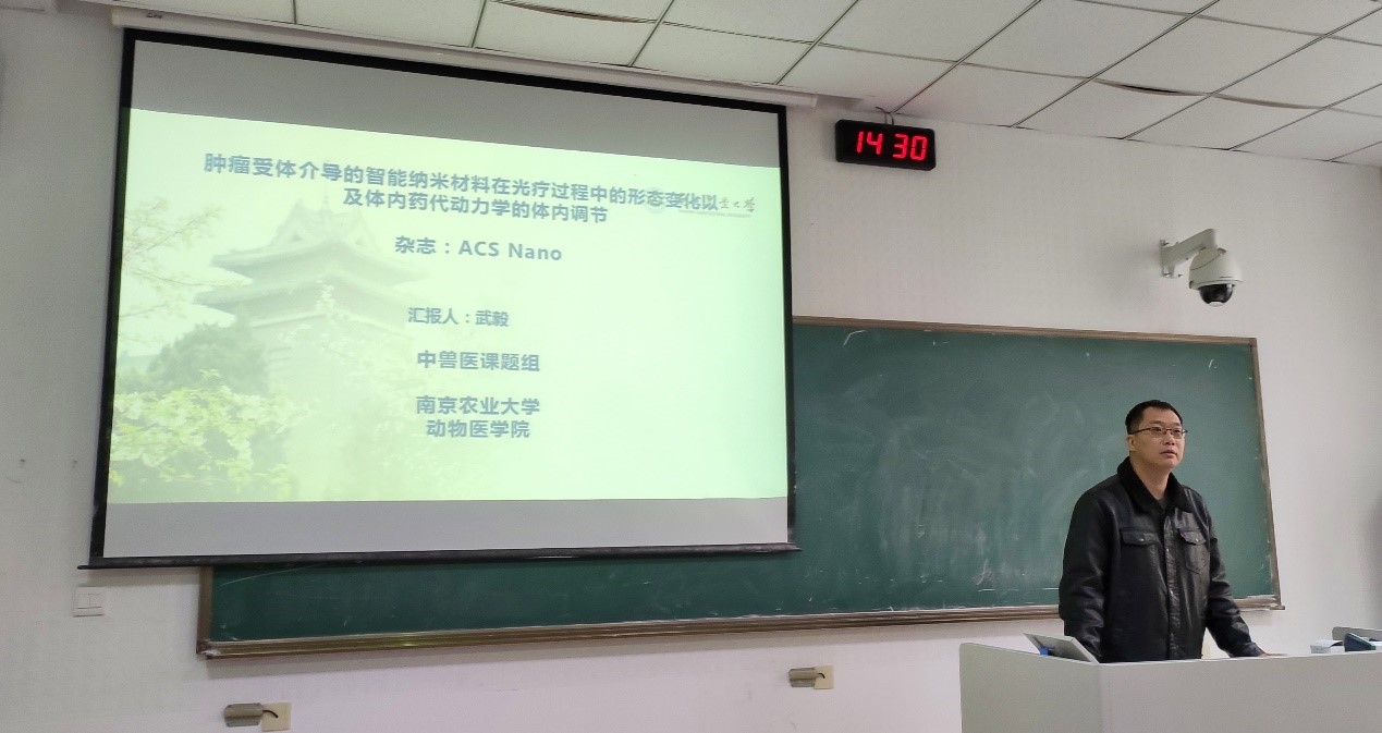 第一位汇报人是副教授武毅,武毅的汇报题目是《肿瘤受体介导的智能纳米材料在光疗过程中的形态变化以及体内药代动力学的体内调节》。武毅主要介绍了智能肽纳米光治疗剂的研究。通过固相合成技术、体外活细胞培养等,研究智能肽纳米材料的合成。利用光稳定性、热稳定性与动物活体实验,探究不同形态的智能纳米材料的稳定性及治疗作用效果。最后武毅还建议同学们可以尝试采用新型材料开展实验研究,让在场同学收获颇丰。