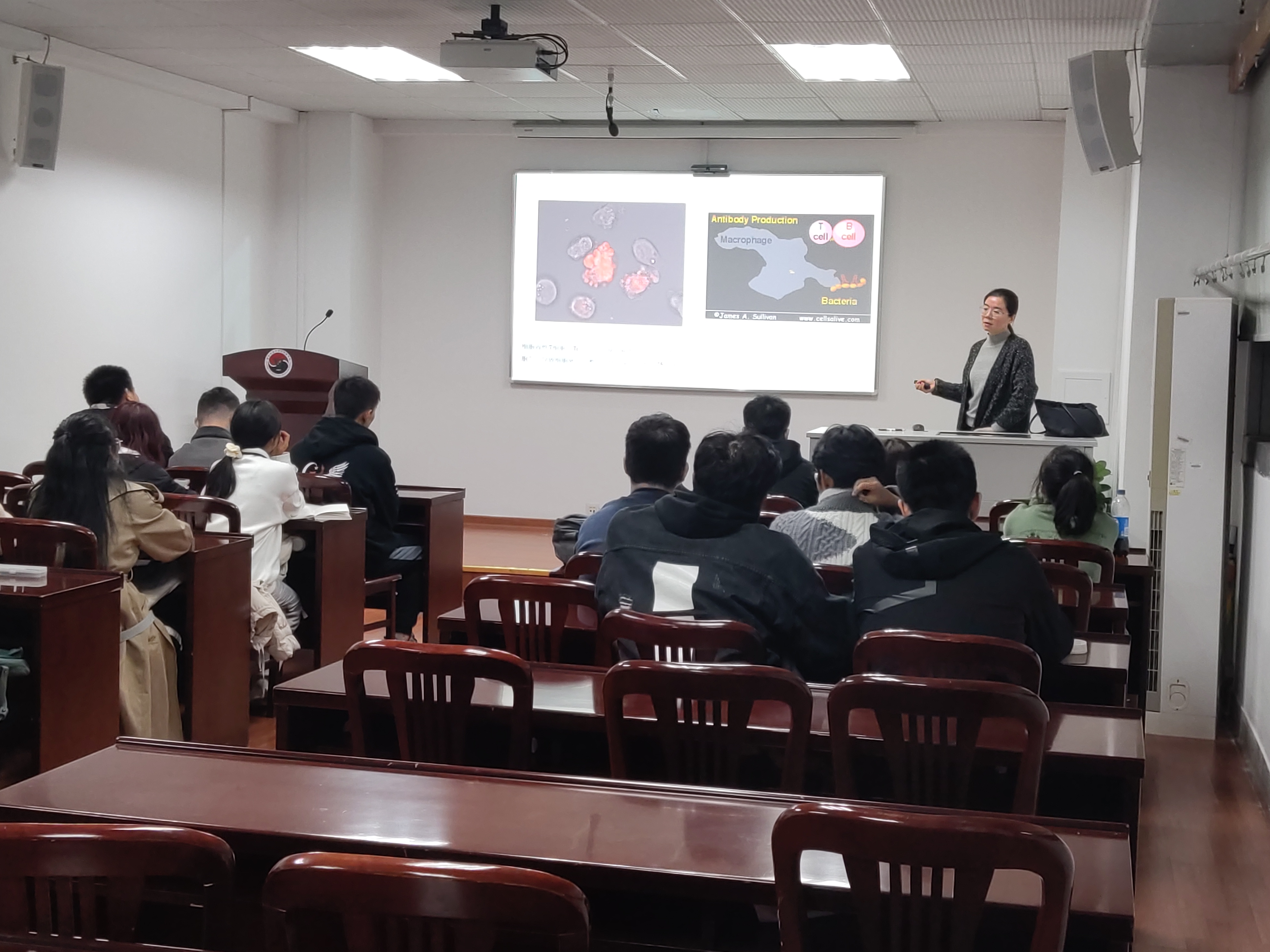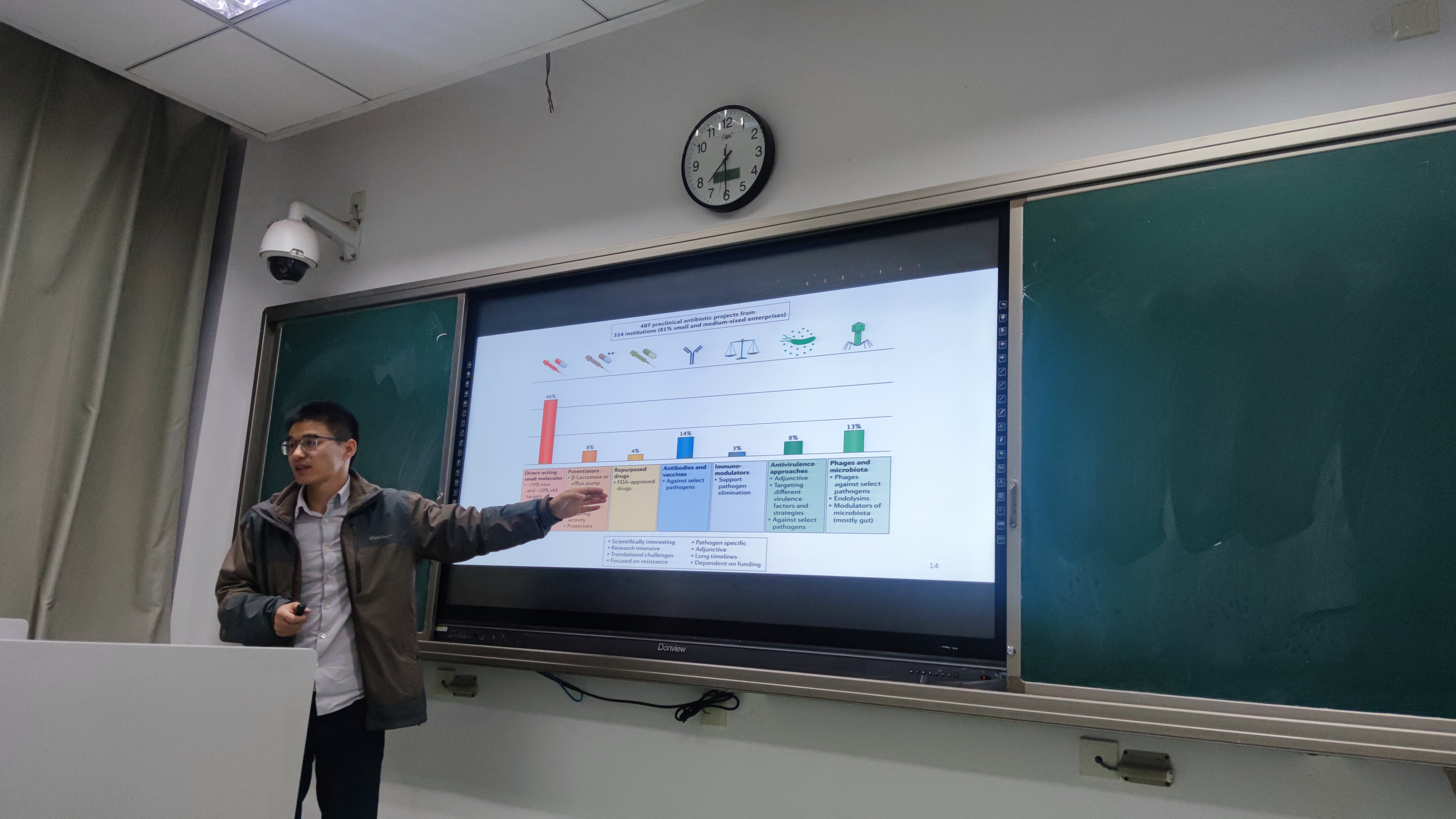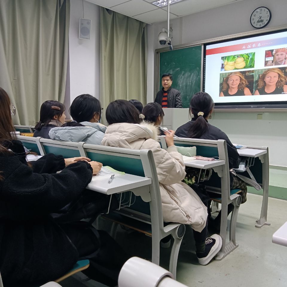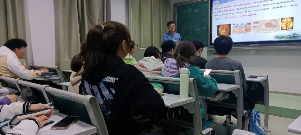 黄金虎副教授以"化疗三角——细菌与抗菌药物的军备竞赛"为主题,通过化疗三角——药物、动物和病原,向同学讲述了药物的发展史,同时黄金虎按照时间顺序讲了抗生素的发展史,提出了后抗生素时代如何对抗“耐药细菌感染”的问题,让同学们对动药专业有了初步认识。同时黄金虎鼓励同学们积极学习,多了解一些动药的相关信息。