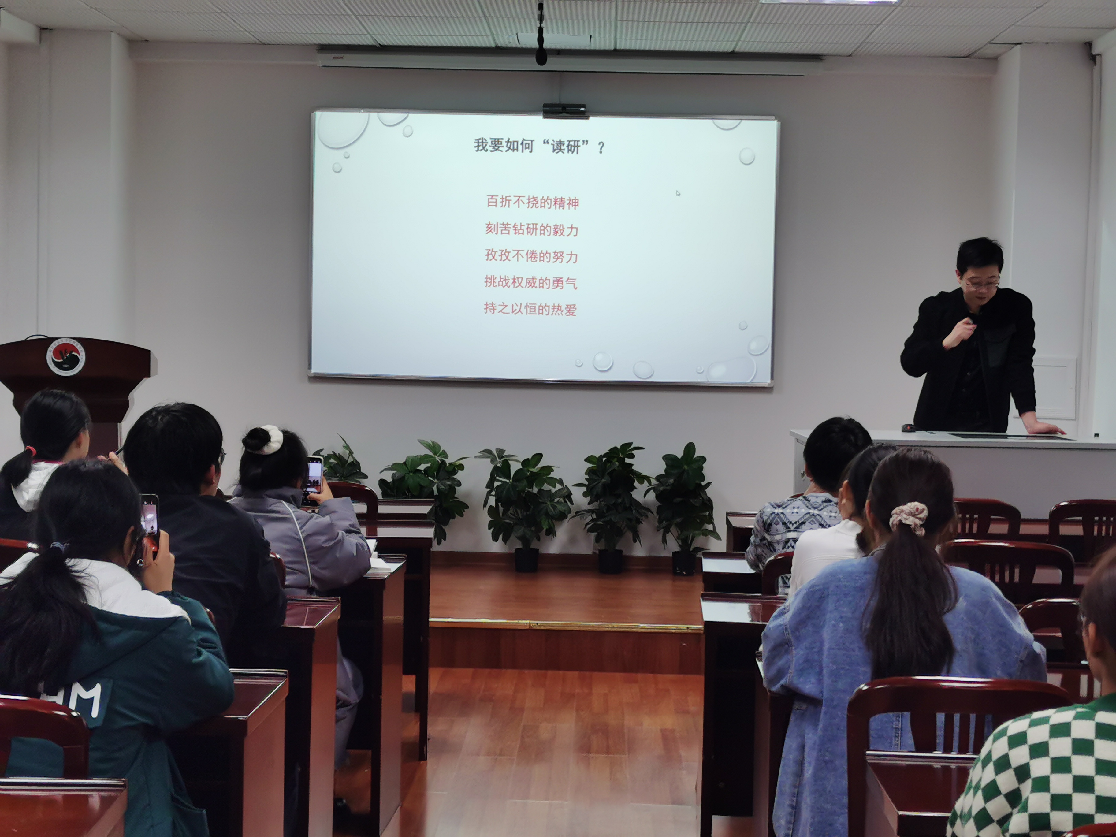 马喆教授以“有关“读研”的一些思考”为题,讲解了“为什么‘读研’这么热” 。之后马喆和同学们讨论了“‘读研’的本质是什么”,马喆认为,研究生的任务就是从事科学研究,解决科学问题。紧接着,马喆让同学们考虑关于读研的一些现实问题,又向同学们讲述了社会的人才需求,让同学们可以更好地思考是否读研。最后,马喆希望同学们以百折不挠地勇气,刻苦钻研的毅力以及孜孜不倦的勇气进行往后的学习。