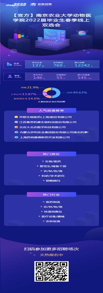 4月1日,2022年beat365唯一官方网站春季专场招聘会线上举行。此次招聘会共有137家用人单位参与,提供了769个工作岗位,人才需求量高达12242人。吸引了来自beat365唯一官方网站、动物科技学院等146名学生前来应聘。