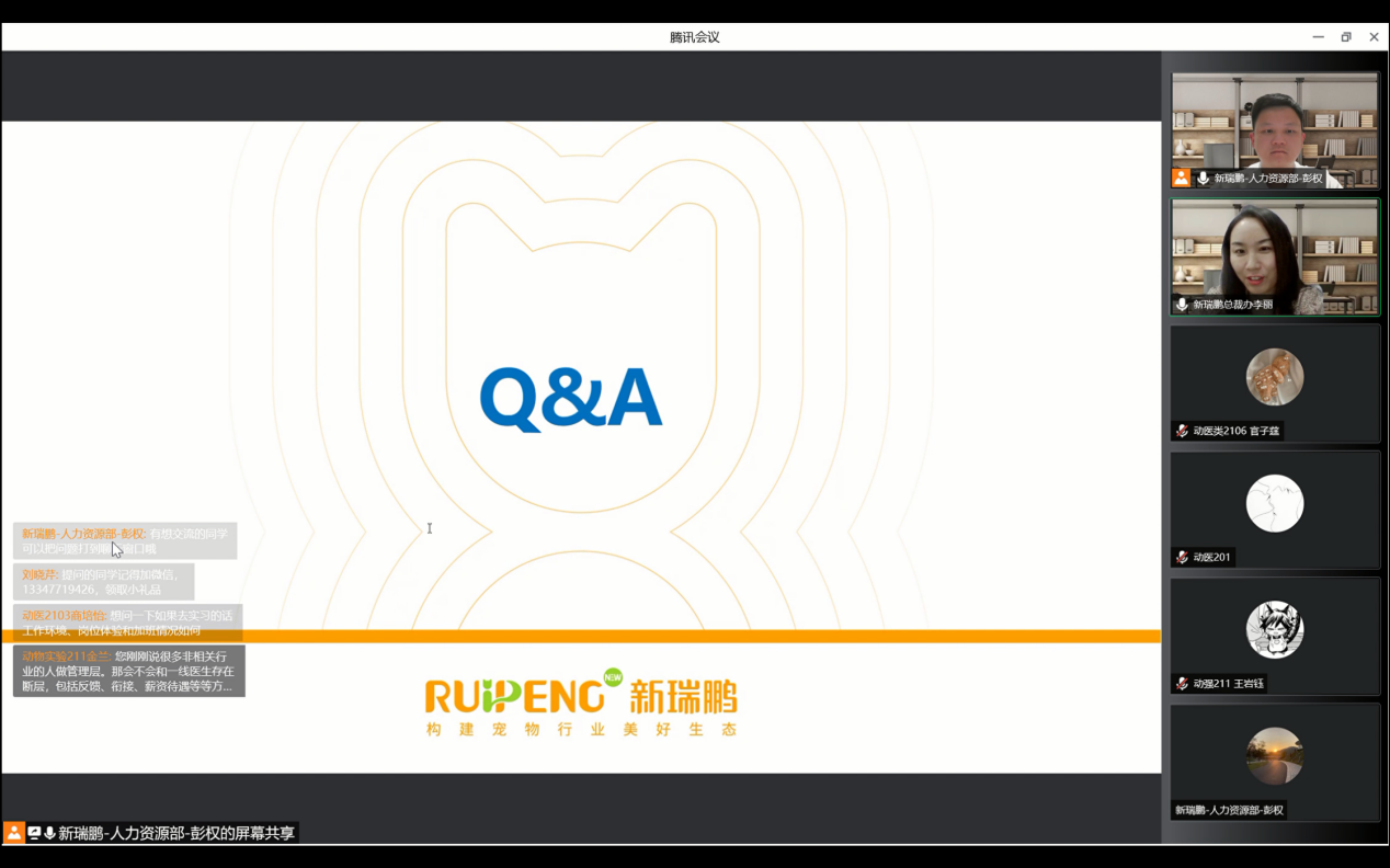 5月5日晚7:00,beat365唯一官方网站联合新瑞鹏集团举行的“遇见新瑞鹏 遇见新未来”大咖面对面活动在线上如期进行。beat365唯一官方网站邀请到新瑞鹏宠物医疗集团副总裁李丽女士和新瑞鹏宠物医疗集团南京区艾贝尔医院兽医师袁征先生,以及各区负责人围绕新瑞鹏宠物医疗集团为同学们介绍宠物医疗行业的发展状况。