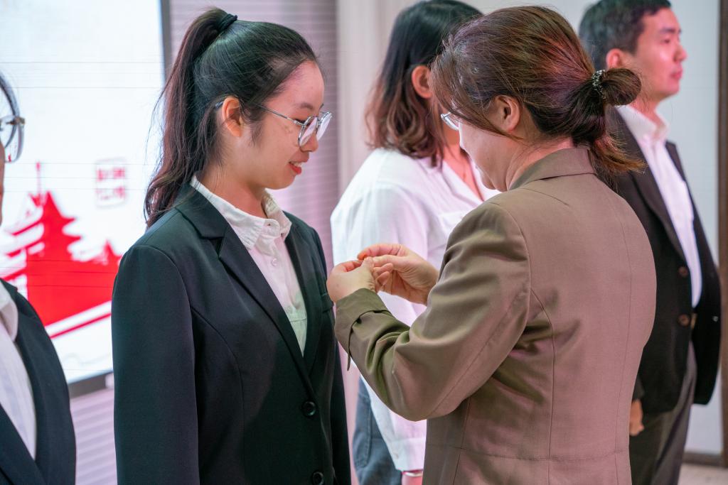 开班典礼上,姜岩为5名新发展党员代表佩戴党徽,32名新发展师生党员面向党旗进行庄严宣誓。李云锋宣读了学院2022年上半年新发展党员名单。