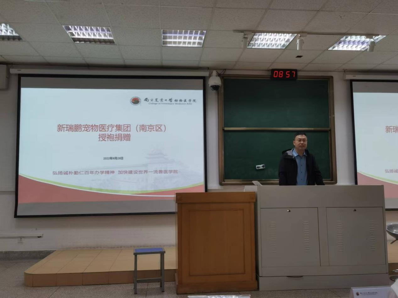 授袍仪式由曹瑞兵副院长主持。周振雷介绍了动物医学院和瑞鹏宠物医疗集团(南京区)长期以来的良好合作关系。张伟东介绍了瑞鹏集团的发展过程及宠物诊疗行业的良好前景,鼓励同学们积极加入宠物诊疗行业。董颖波副总以“宠物医疗市场和新技术发展概况”为题,为学生介绍了宠物行业的发展历程及前景,同时阐述了数字化、智能化在动物医疗方面的应用,及先进设备走进宠物行业使动物像人一样可以接受先进治疗。