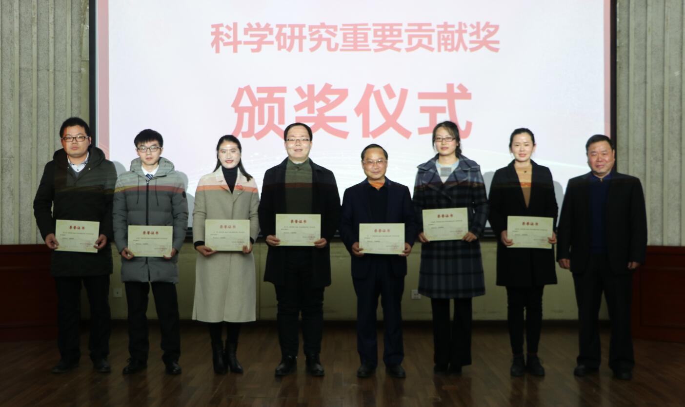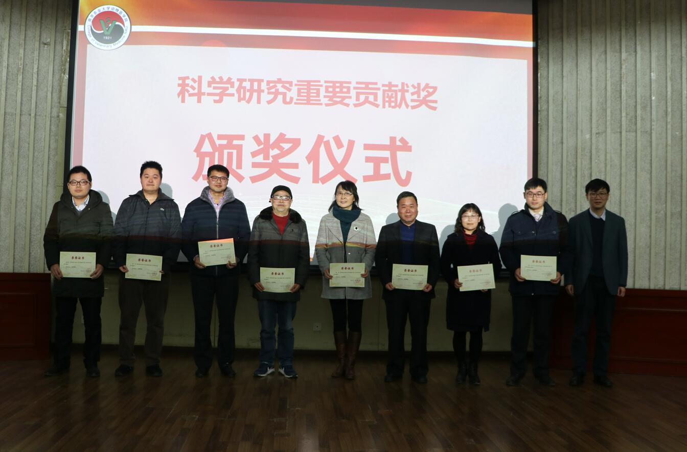 李祥瑞和苗晋锋分别为科学研究重要贡献奖获奖者颁奖;