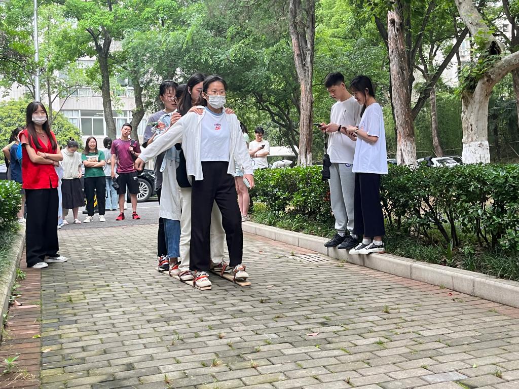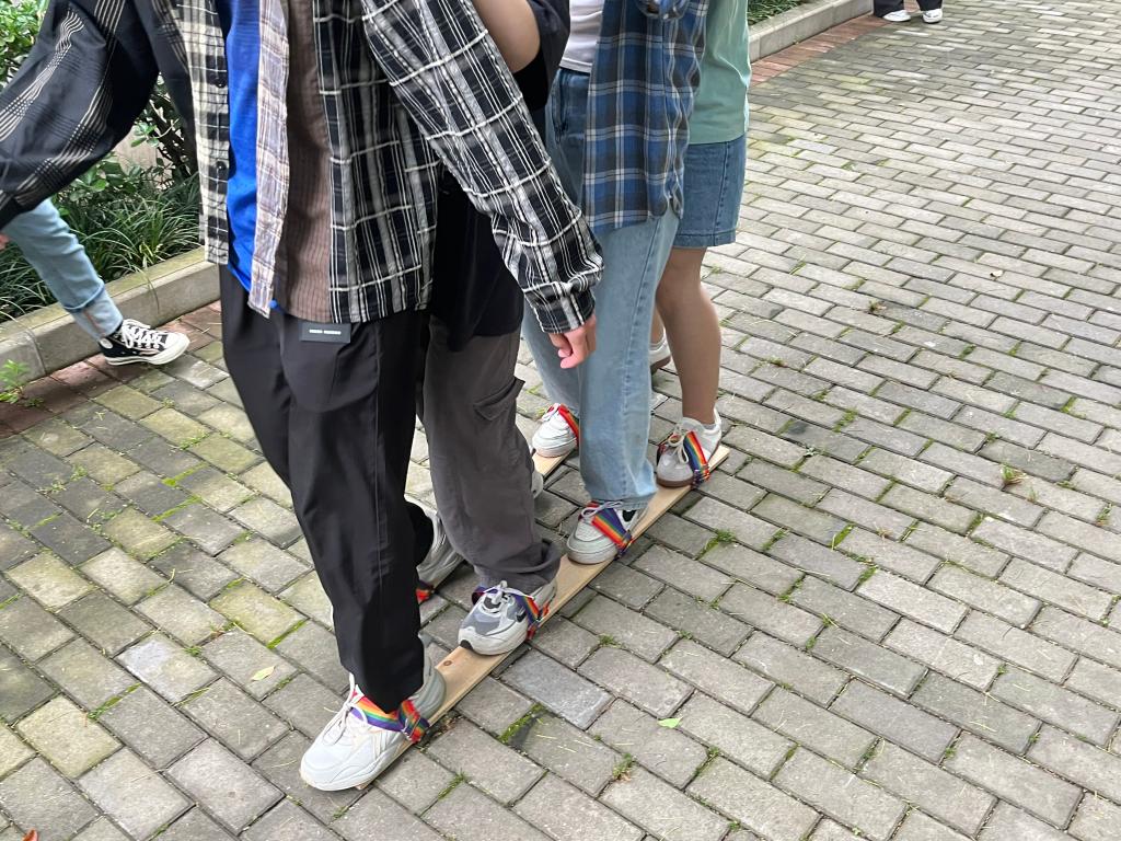 各个小组成员脚踏木板鞋,协同动作前进。此环节培养了团队协作能力,增强队伍的凝聚力,激发了团队的意志力,团队步调一致才能取得胜利。