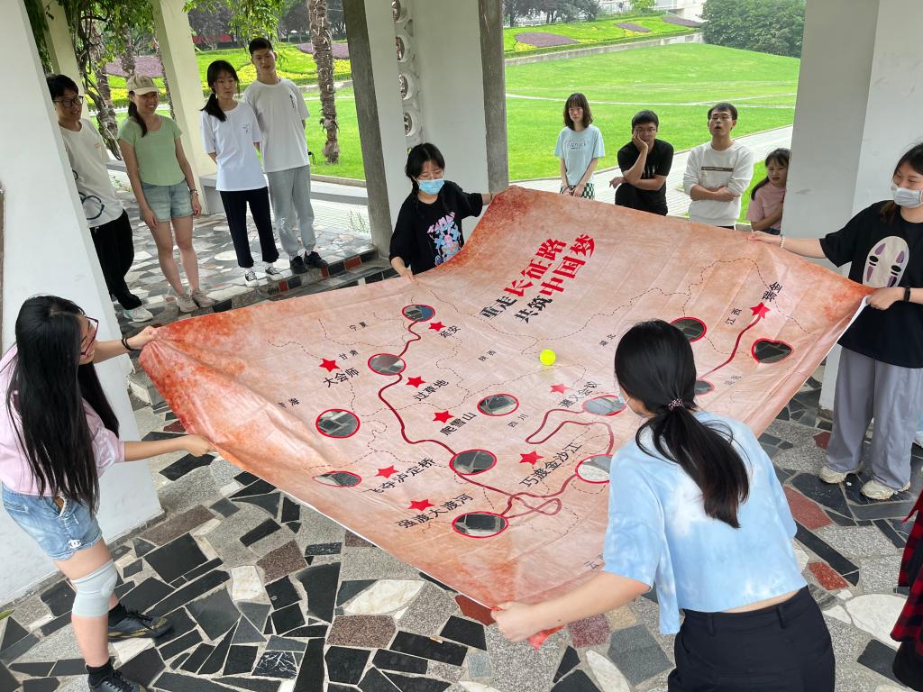 以网球代表“中央红军”,地图画布模拟“中央红军长征路线图”,小组成员各执一角,调整画布的倾斜幅度,推动网球沿着红军长征路线前进。带领同学们领会长征精神,体验长征的艰难险阻。