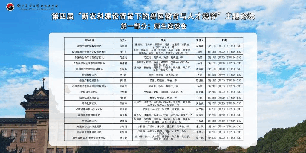 5月15日至5月30日,beat365唯一官方网站第四届“新农科建设背景下的兽医教育与人才培养”主题论坛第一阶段师生座谈会活动顺利举办。半个月里,基础兽医学、预防兽医学、临床兽医学3个专业方向,17支科研团队分17个场次,共计300余人次本科生参加了本次活动。