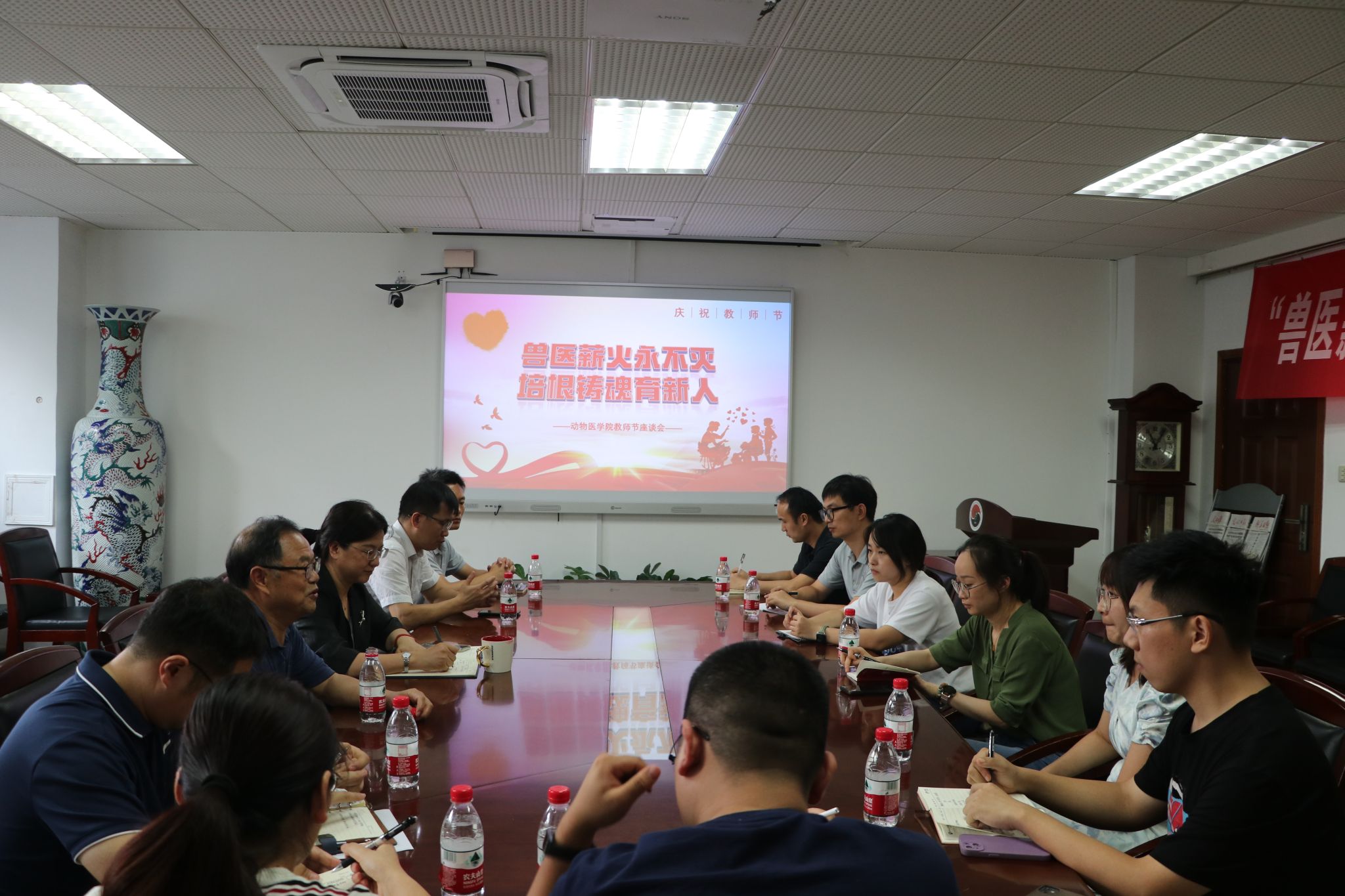 为庆祝第39个教师节,贯彻落实立德树人根本任务,进一步加强老教师“传帮带”作用,激发新教师教书育人的责任感、使命感、荣誉感和职业认同感,beat365唯一官方网站党委联合工会于2023年9月6日下午2:00在逸夫楼3036举办了“兽医薪火永不灭,培根铸魂育新人”新老教师座谈会。学院领导班子、退休教师代表、新进青年教师参加了本次活动,活动由学院工会仇亚伟主持。