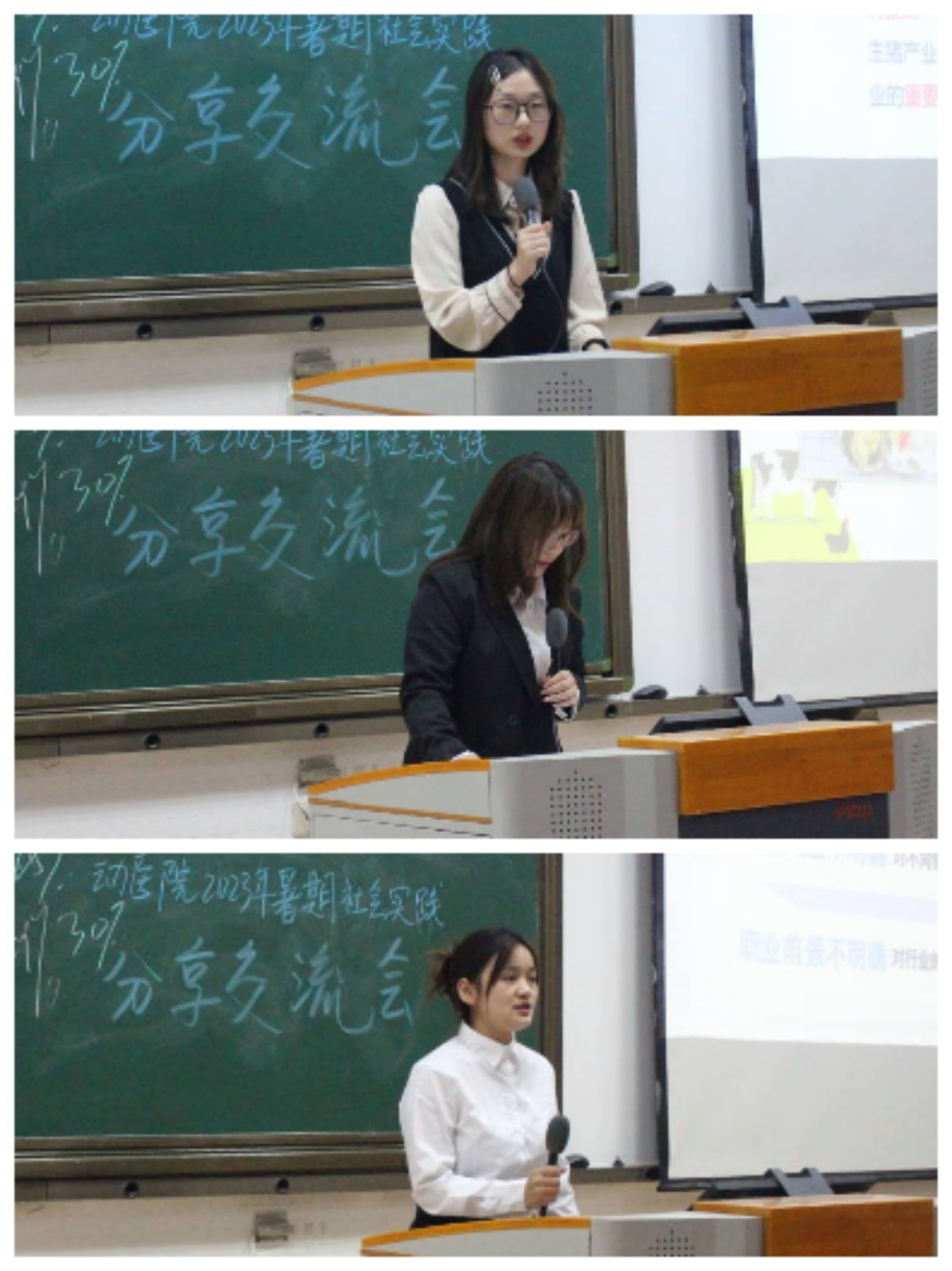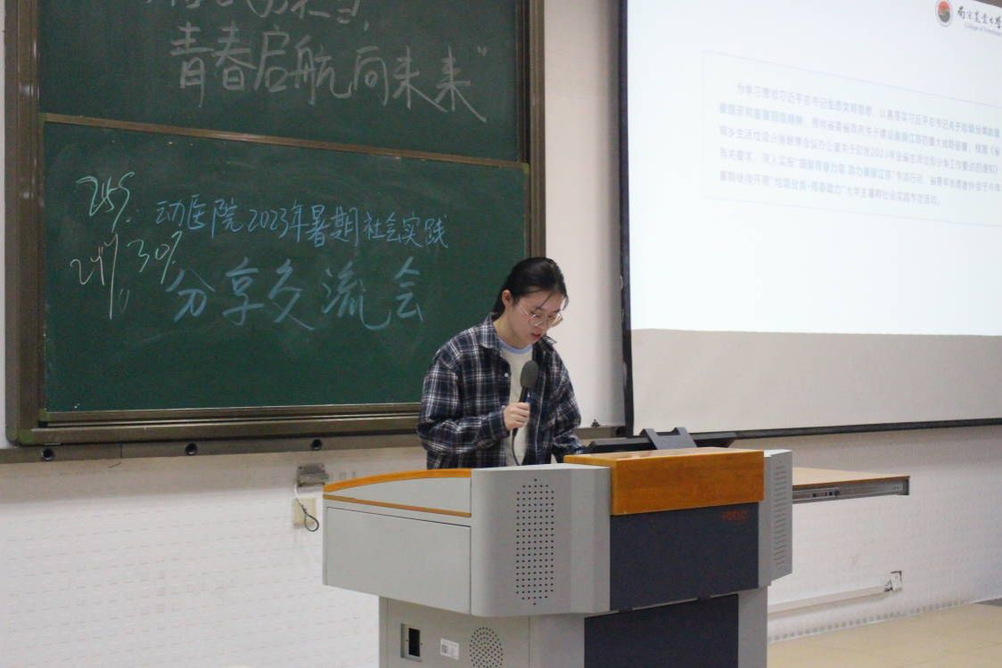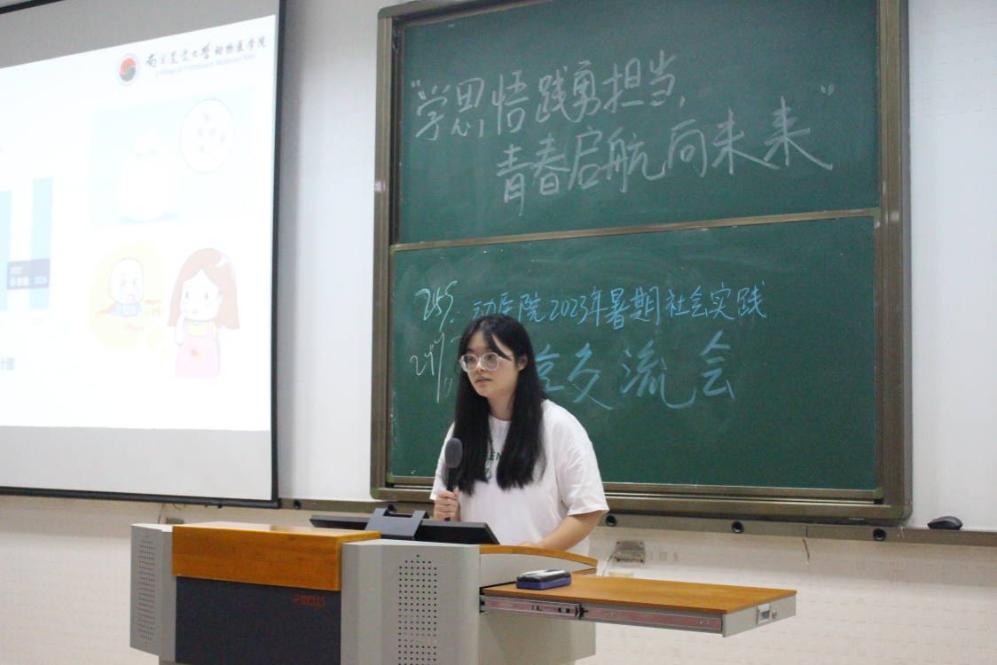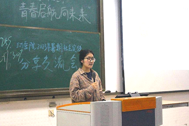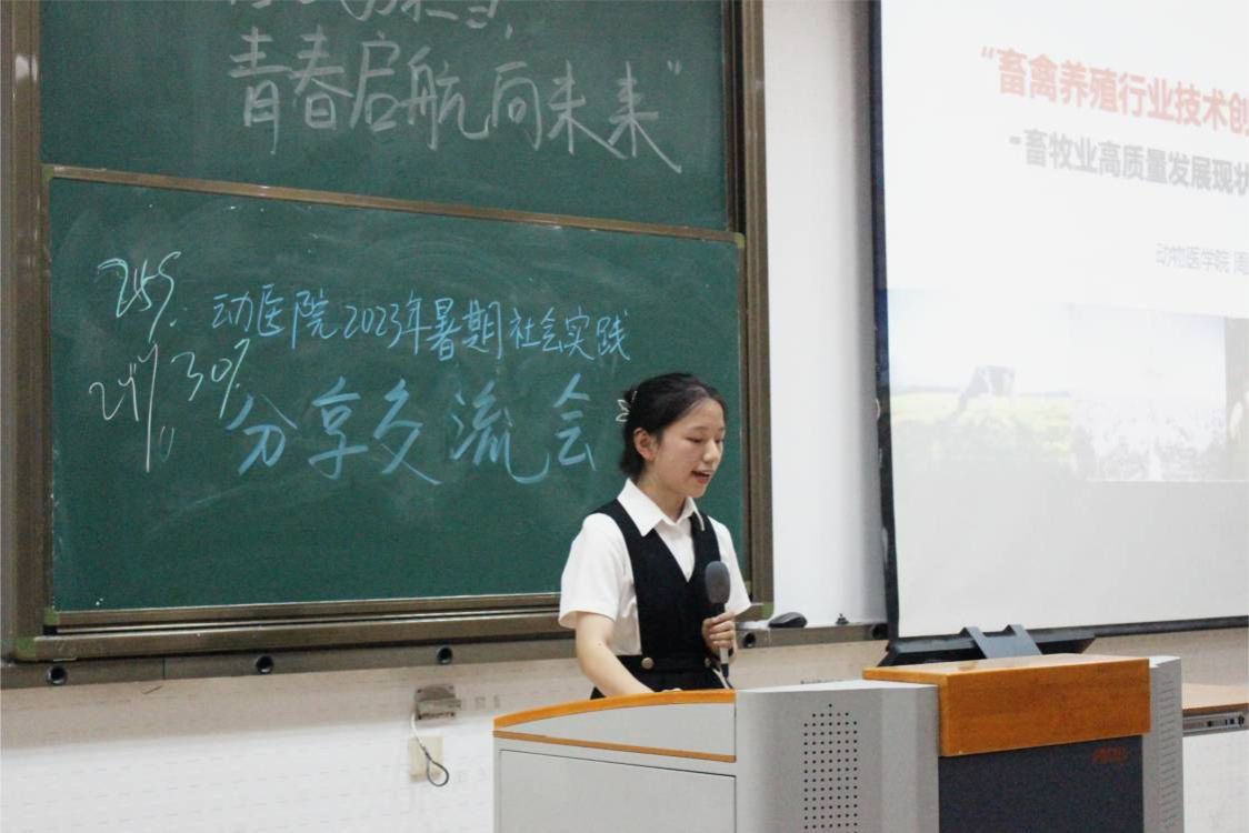 “扬帆行动”企业见习实践团成员但玉娇基于猪场实习经历,详细介绍了猪场内干净的环境、先进的设施和装备;展示了猪场内部的伙食和休闲场所,从产房、保育、育肥和妊娠四个方面分享了个人实习内容。张艺涵基于牧场实习经历,详细介绍了团队成员在挤奶处、繁育处、犊牛处的实习内容,鼓励学弟学妹在实习中要勤于思考,主动提问,敢于请教学习。顾思洁基于宠物诊所实习经历,介绍宠物护理助理、实验室助理、手术助理等工作岗位职责,结合宠物病例,分享了个人所感所悟。
