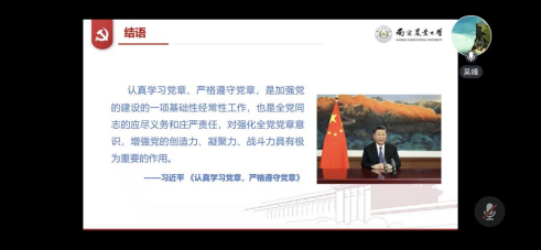 在结语部分,吴峰引用了习近平总书记的《认真学习党章,严格遵守党章》和《中共中央关于党的百年奋斗重大成就和历史经验的决议》总结了党章对每一位共产党员的重要性,鼓励入党积极分子学习党章、遵守党章并按照党章的要求实现自己的青春理想。