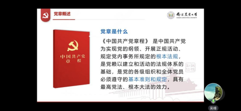 在党章概述部分,吴峰介绍了党章是什么以及党章的总纲和基本架构,接着介绍党章的功能地位。党章对于党的思想、行为和工作等都具有重要指导意义。正所谓,党章是尺、是书、是旗,量出党的规矩方圆、记载党的成果经验、指引党的胜利方向。