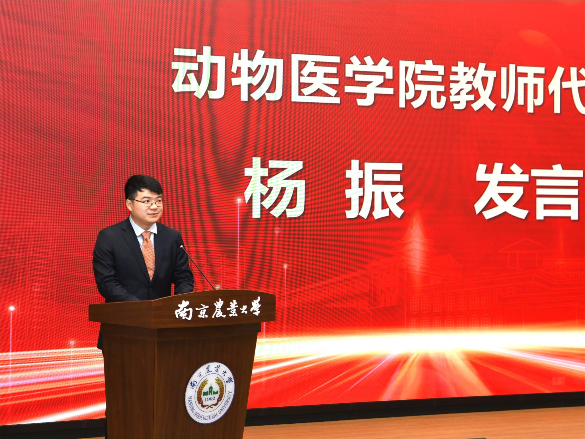 杨振作为学校首批引进的留美归国的DVM(美国执业兽医博士)代表发言,他表示罗清生作为最早一批的留美DVM,他对祖国的热爱和对兽医学科发展的贡献将永远指引激励青年教师不断奋进。