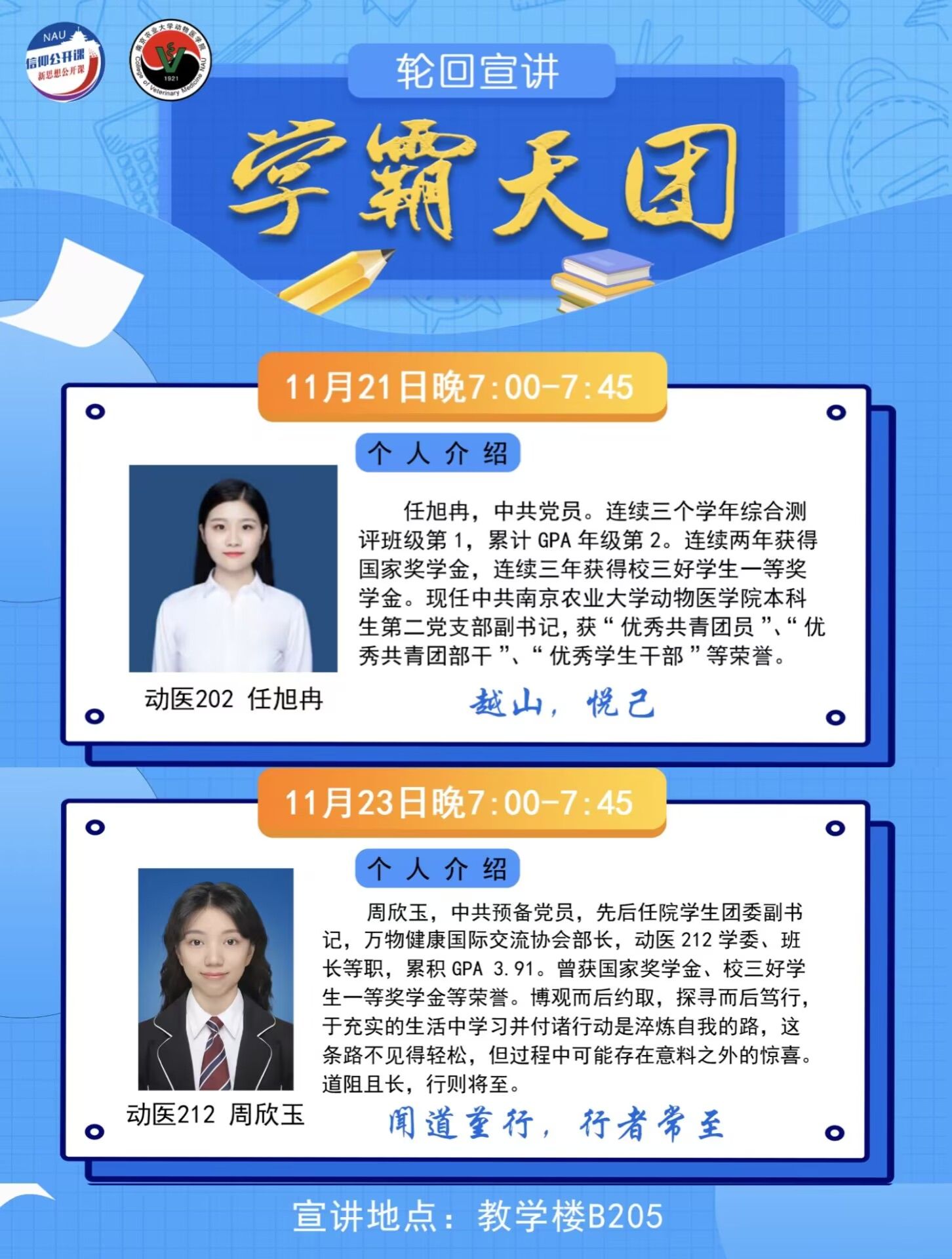 2023年11月21日与23日,beat365唯一官方网站“学霸天团”轮回宣讲活动第二期成功举办。本次活动邀请动医202任旭冉、动医212周欣玉两位同学,为22、23级动医学子分享自己的学习经验。
