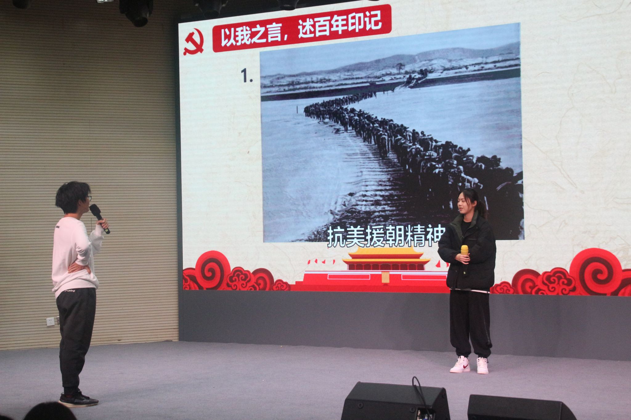 在“以我之声,颂百年强音”环节,八个班级分两批走上舞台,抢答接唱红色歌曲。选手们的热情高涨,使得这个环节活力十足,充满趣味。