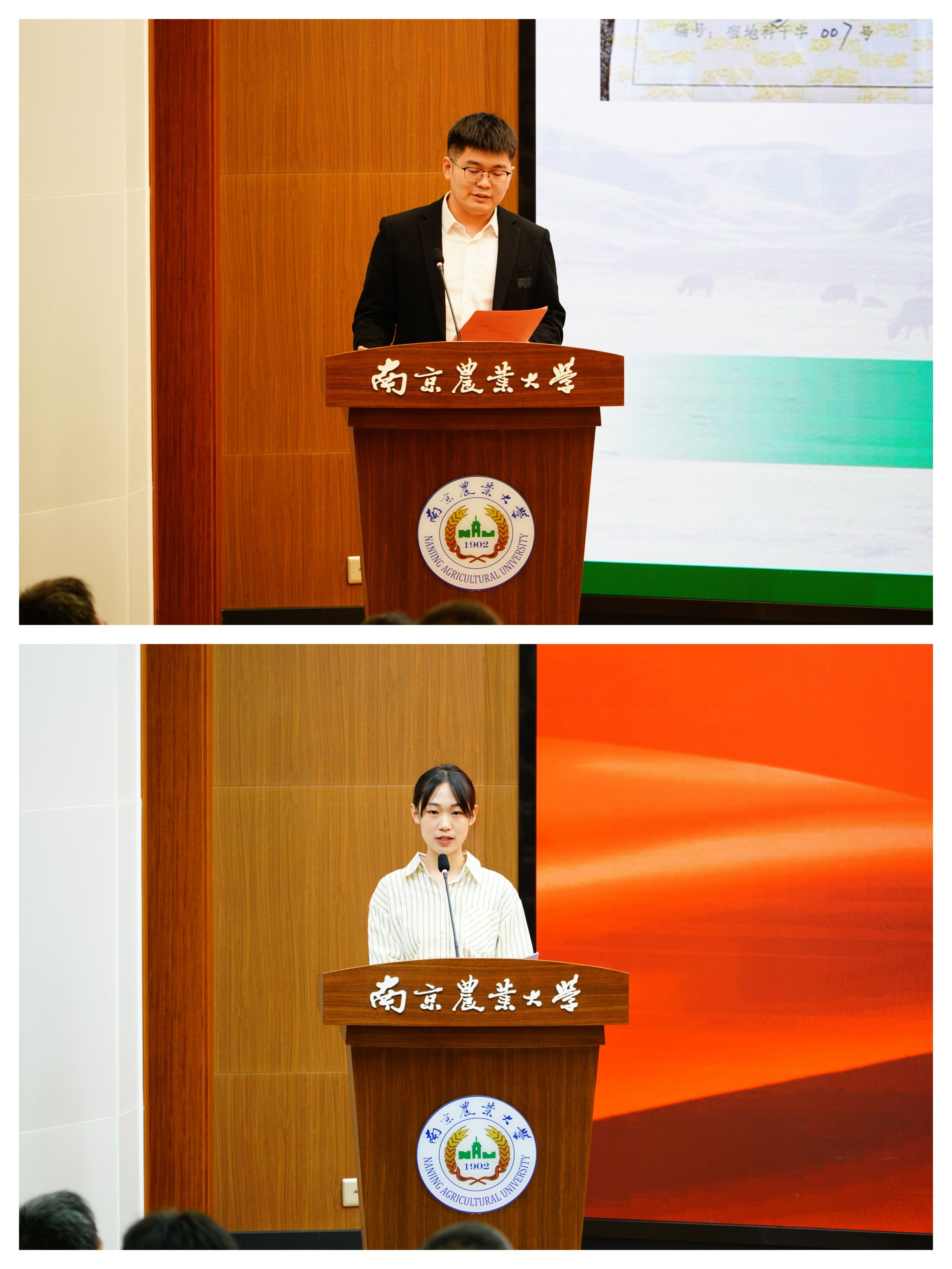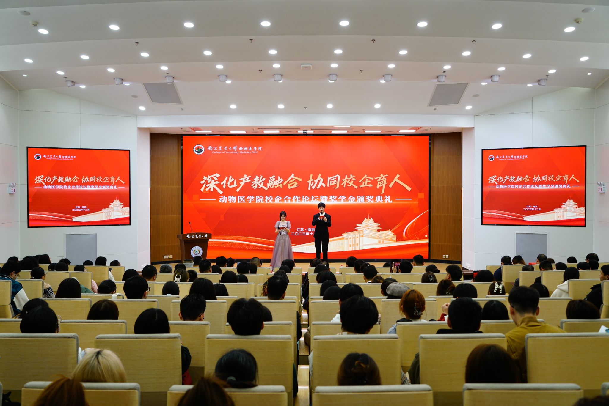 获奖学生代表预防兽医学博士生潘飞和动物药学专业本科生刘雨桐上台作个人事迹分享。