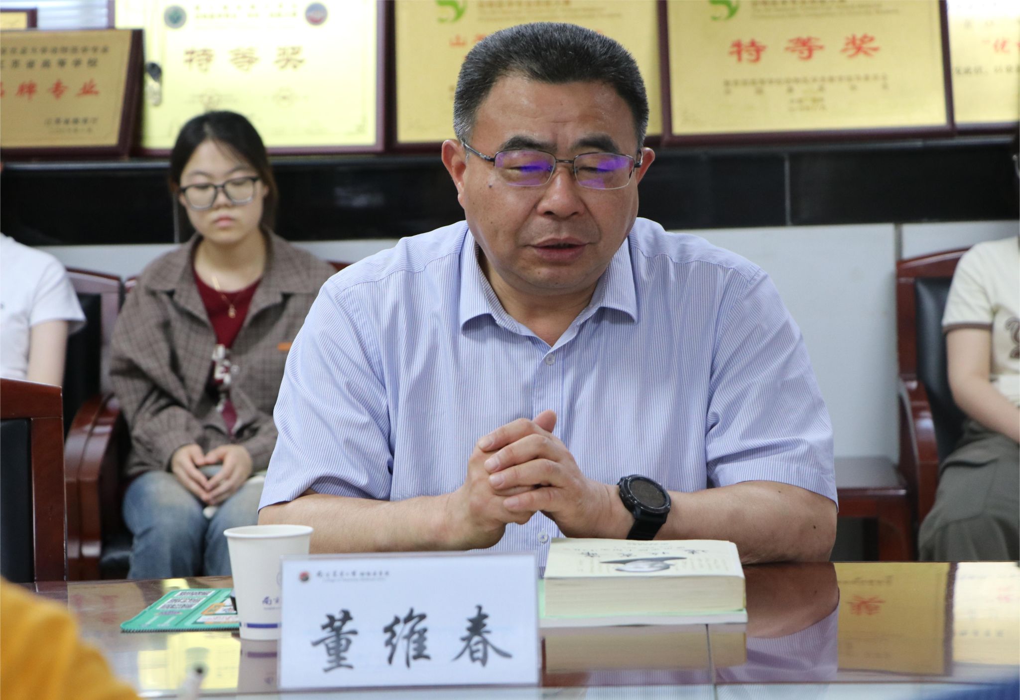 董维春与本一支部党员亲切互动交流,探讨beat365唯一官方网站院徽元素构成与内涵,讲述学院悠久历史、重要人物及发展成就。